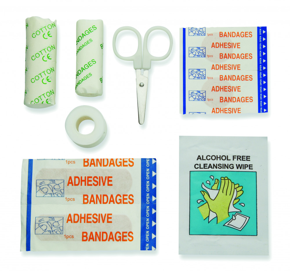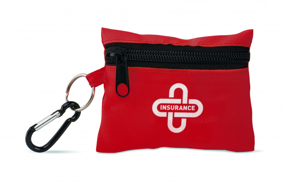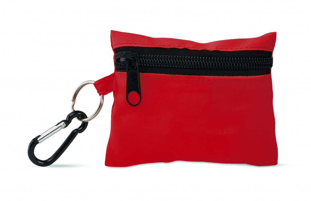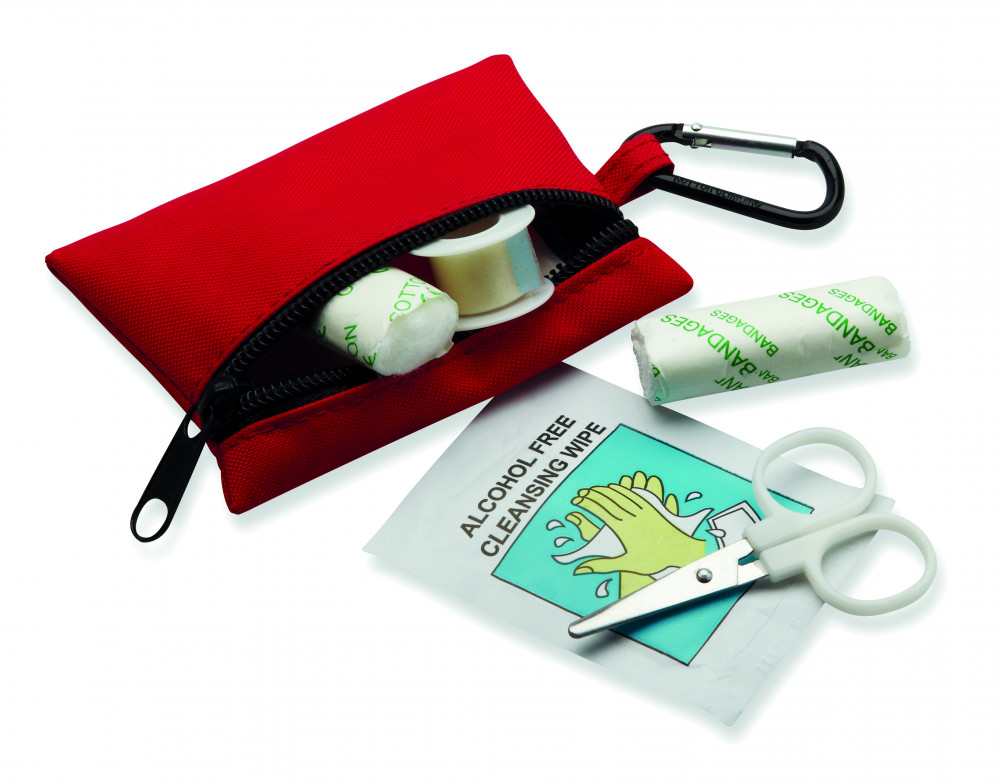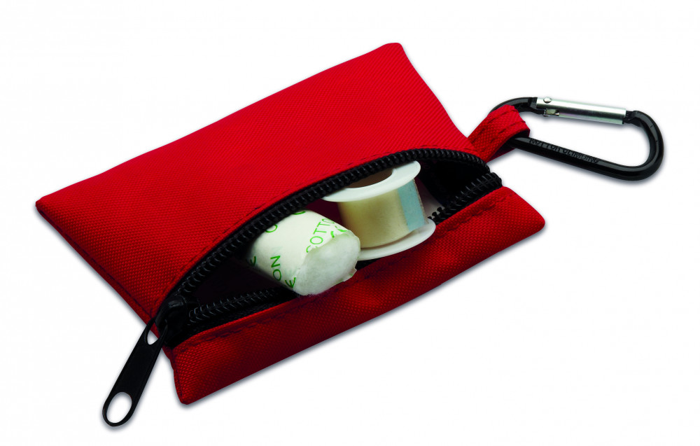 Elsősegély készlet. Tartalma: olló, nedves törlőkendő, géz, 3 fültisztító, 5 sebtapasz. Poliészter tokban, karabinerrel.