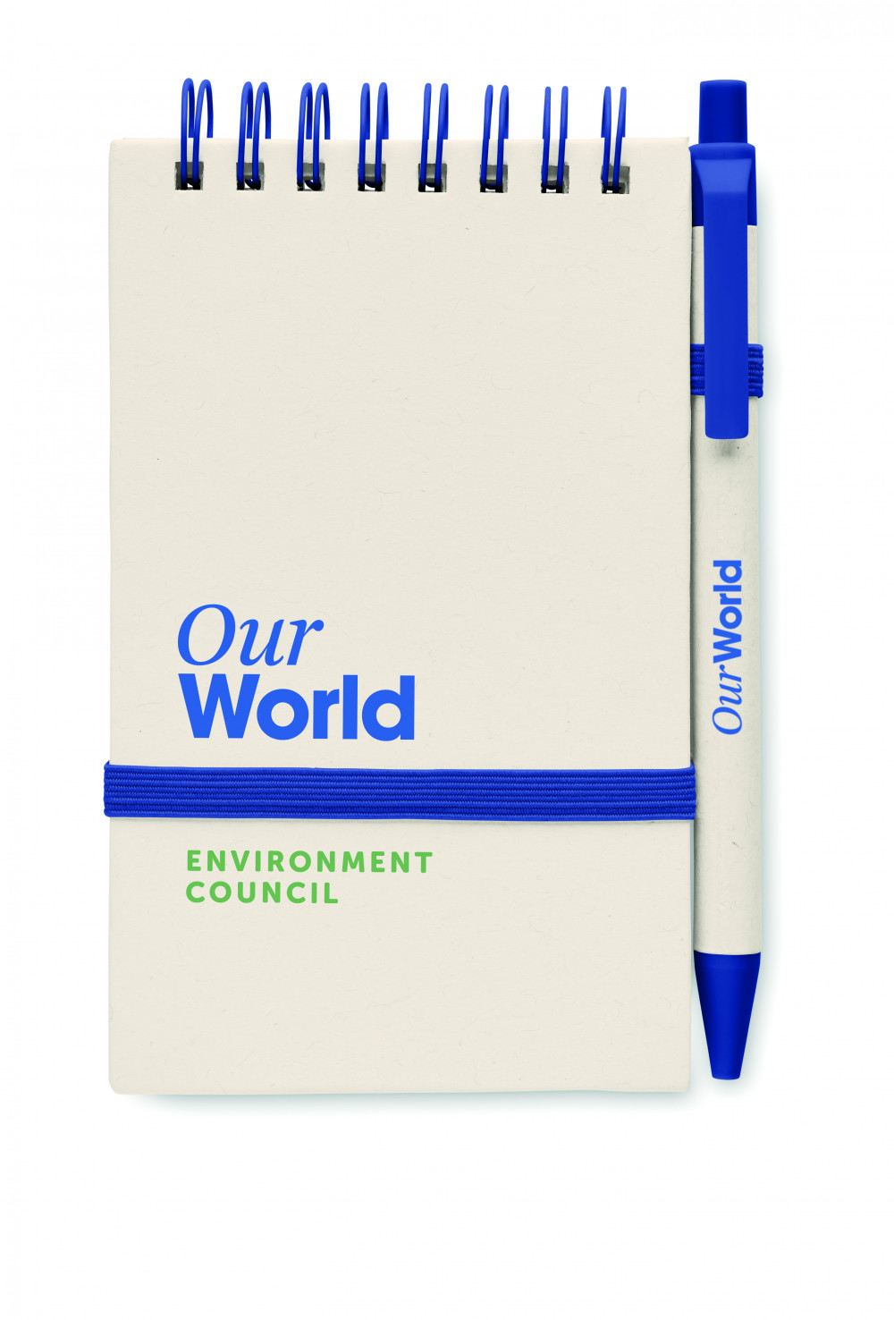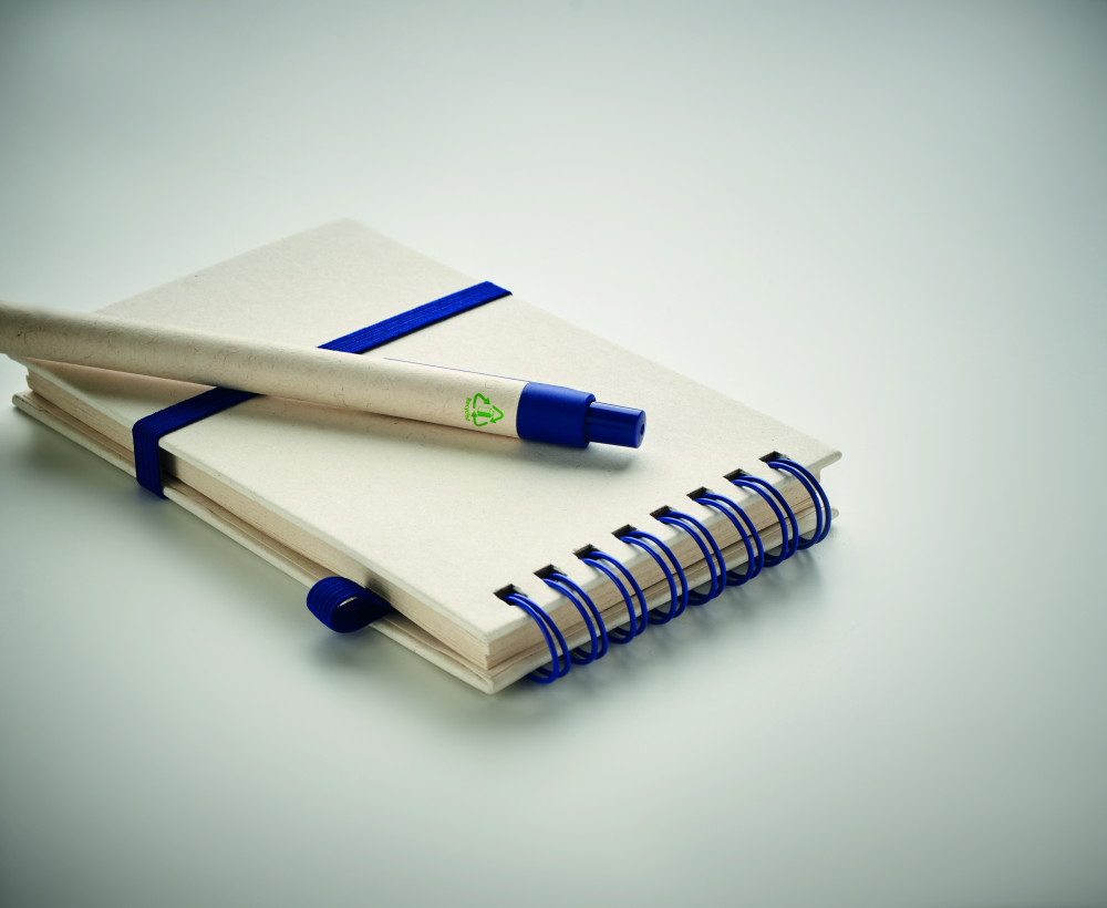 A6 spirálozott jegyzetfüzet. 70 sima lap, 70% újrahasznosított tejesdobozból és 30% újrahasznosított papírból. Hozzáillő nyomógombos golyóstoll, kéken író betéttel. Elasztikus zárópánt és tolltartó hurok.