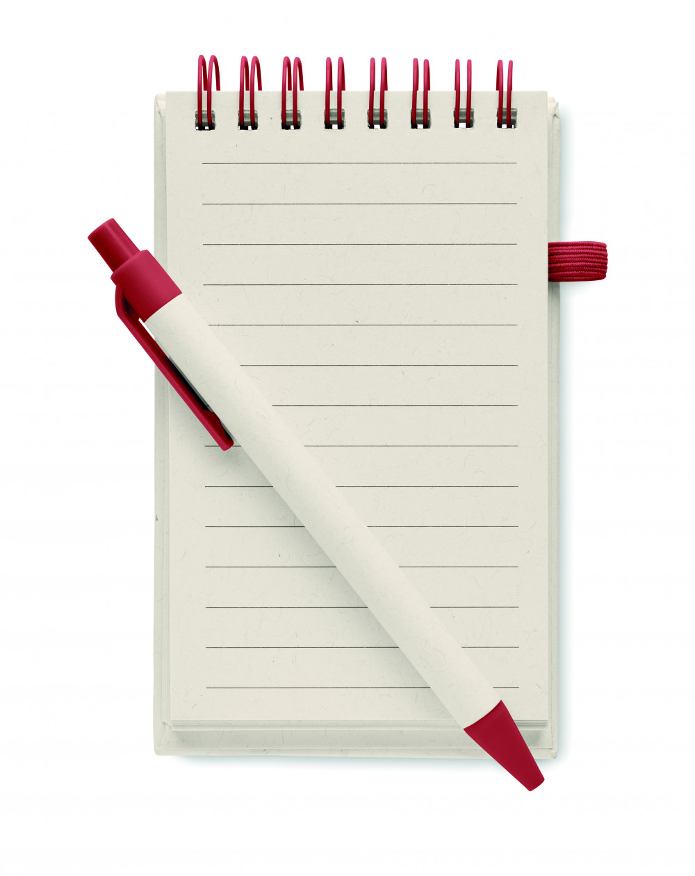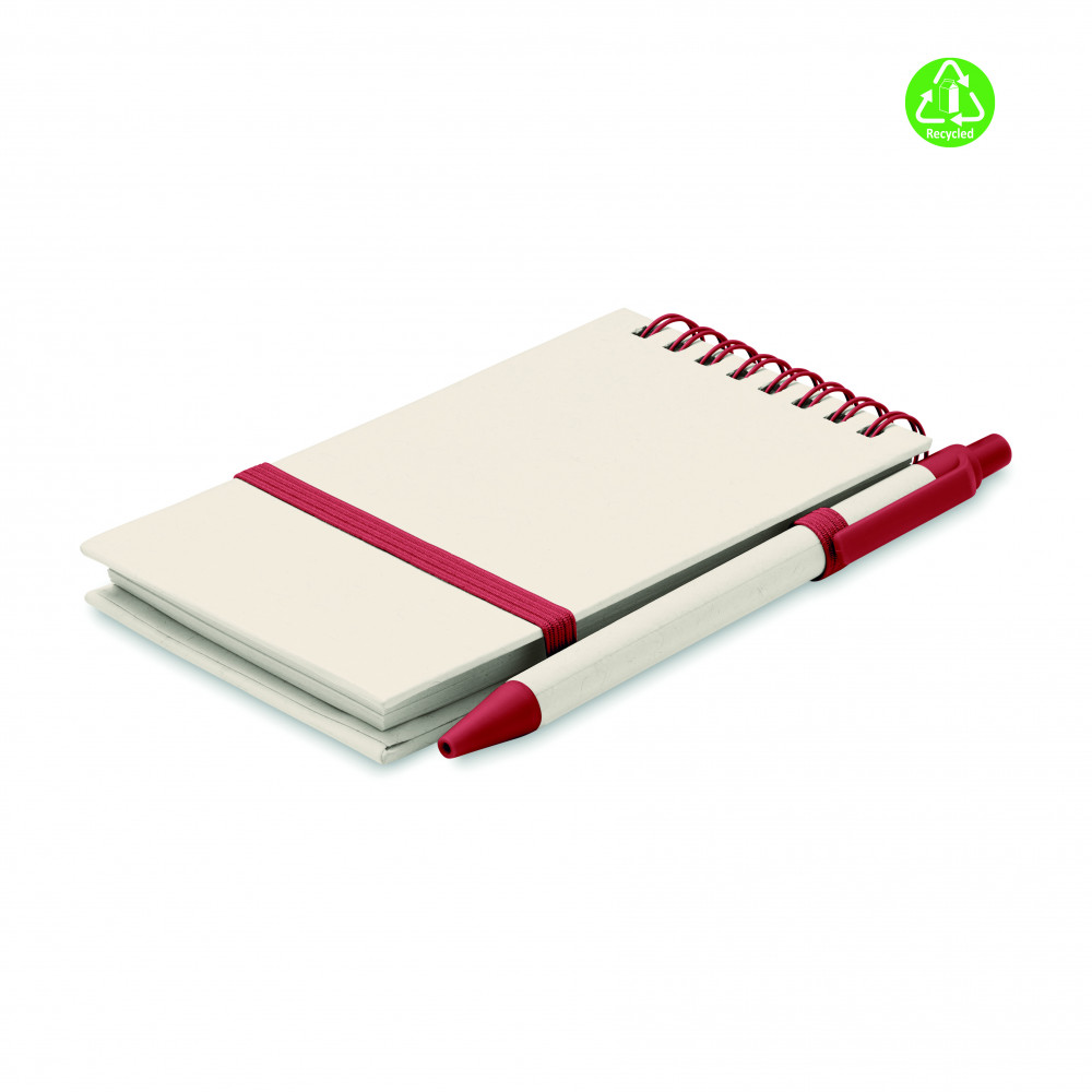 A6 spirálozott jegyzetfüzet. 70 sima lap, 70% újrahasznosított tejesdobozból és 30% újrahasznosított papírból. Hozzáillő nyomógombos golyóstoll, kéken író betéttel. Elasztikus zárópánt és tolltartó hurok.