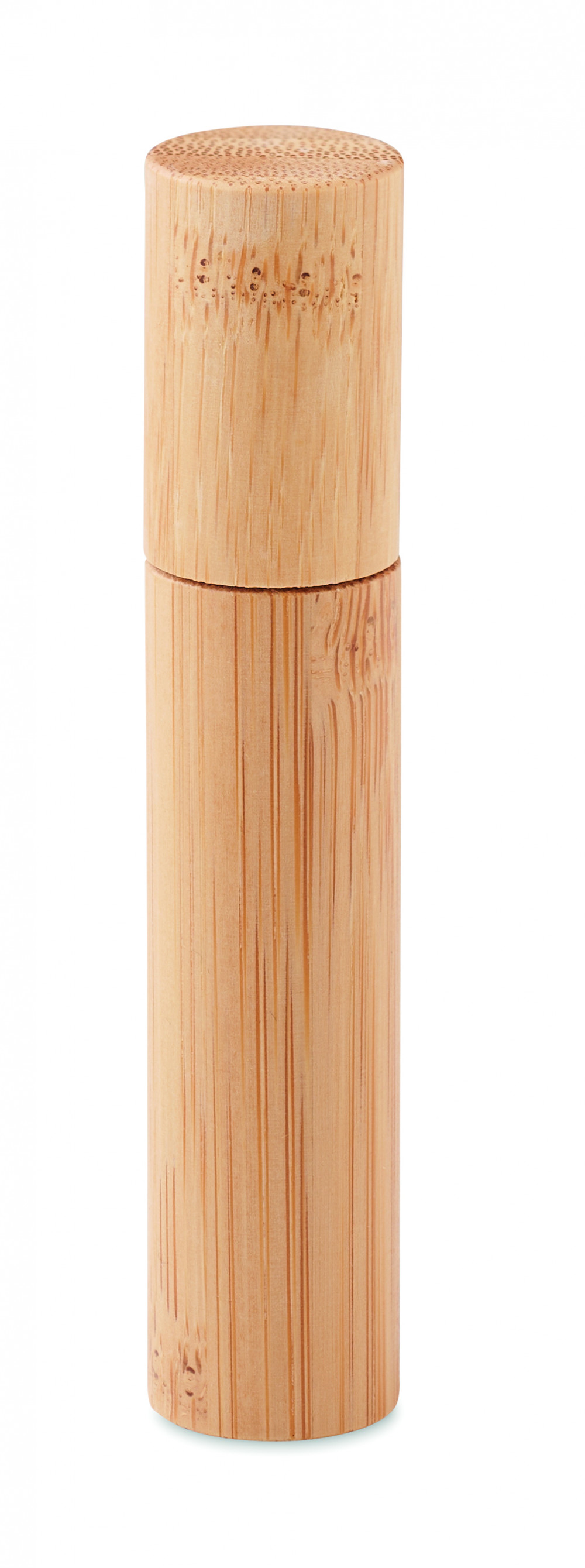 Újratölthető mini parfümszóró üveg bambusz burkolattal. Űrtartalom: 10 ml. A bambusz természetes anyag, színében, mintázatában és méretében esetenként eltérő lehet.