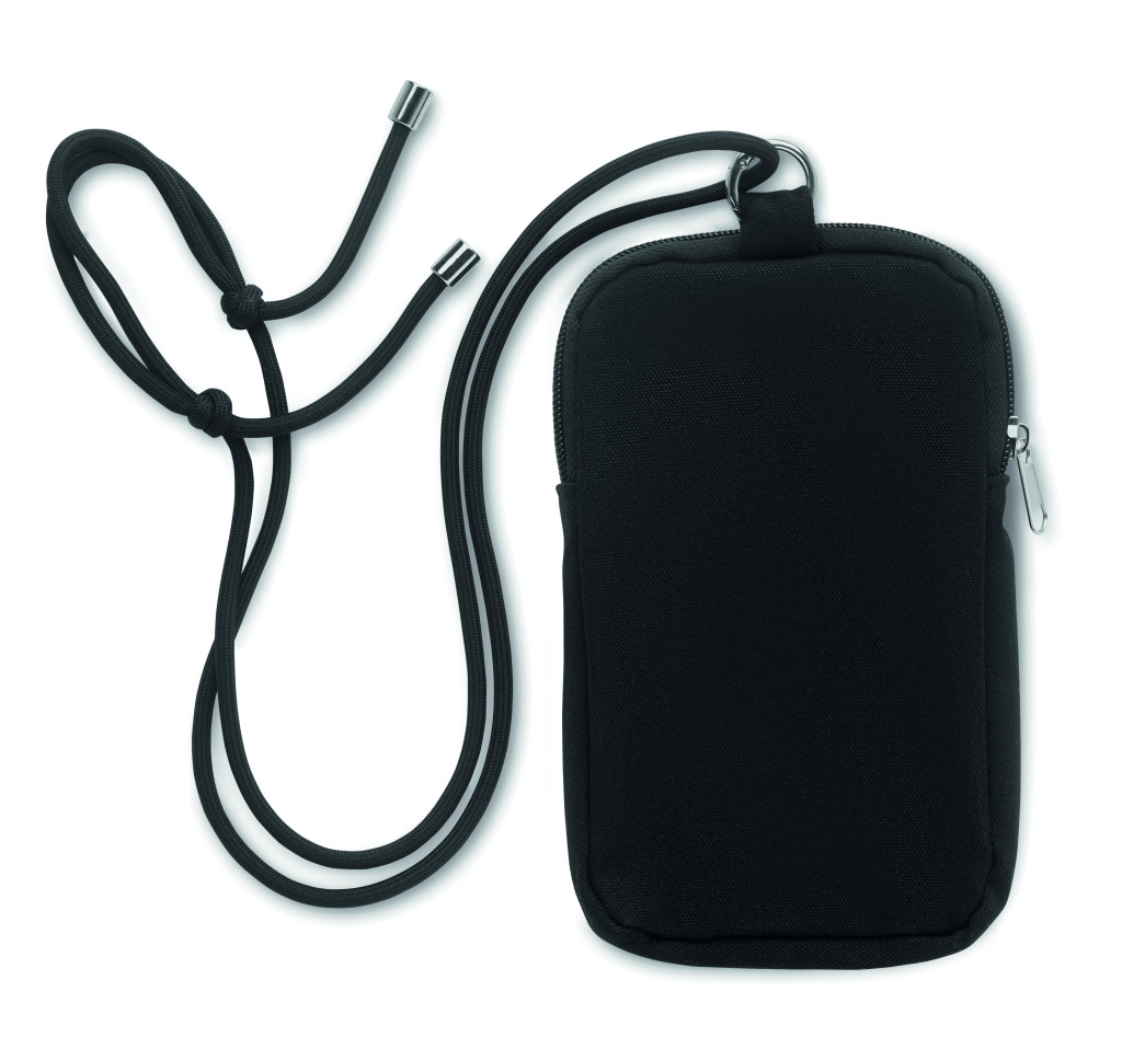 Keresztpántos okostelefon tartó újrahasznosított pamutból, állítható RPET poliészter zsinórral, az elülső oldalán nyitott zsebbel. 280 g/m².