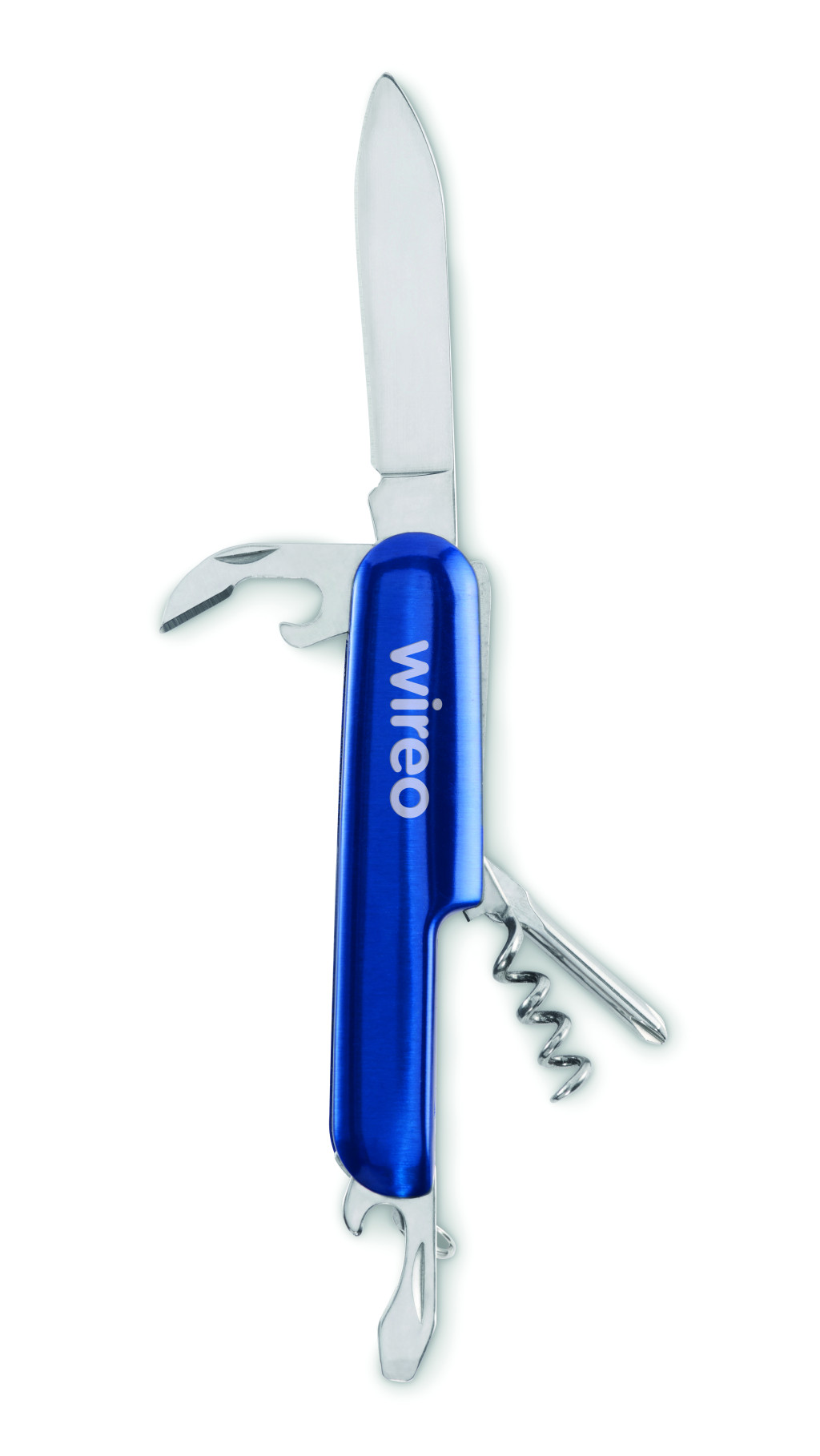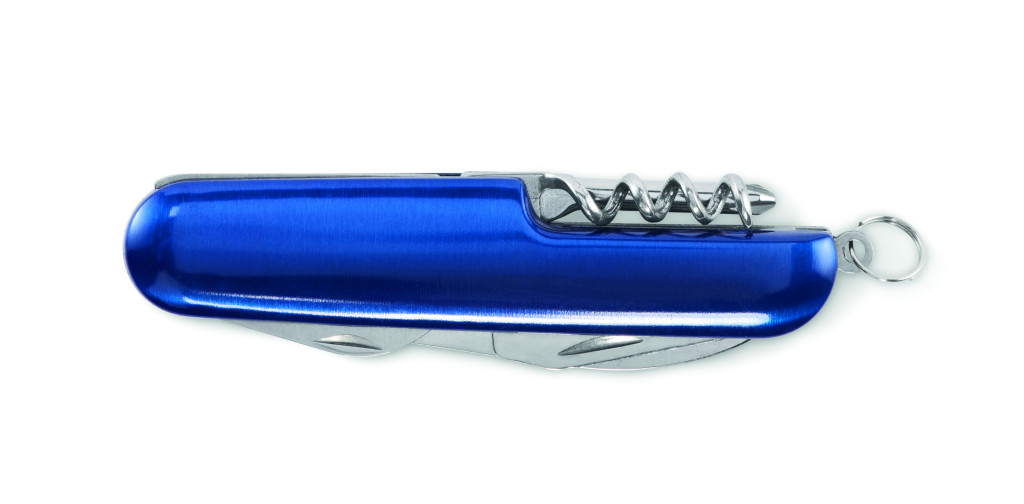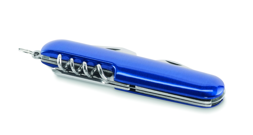 Többfunkciós zsebkés újrahasznosított alumíniumból. 5 funkció: nagy penge, üvegnyitó, csavarhúzó, dugóhúzó és konzervnyitó.