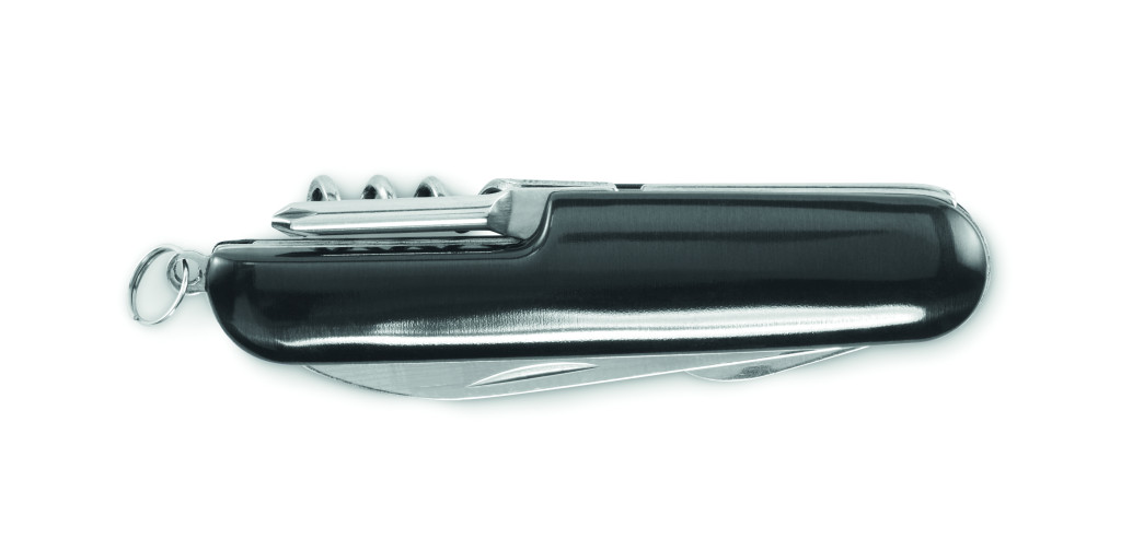 Többfunkciós zsebkés újrahasznosított alumíniumból. 5 funkció: nagy penge, üvegnyitó, csavarhúzó, dugóhúzó és konzervnyitó.