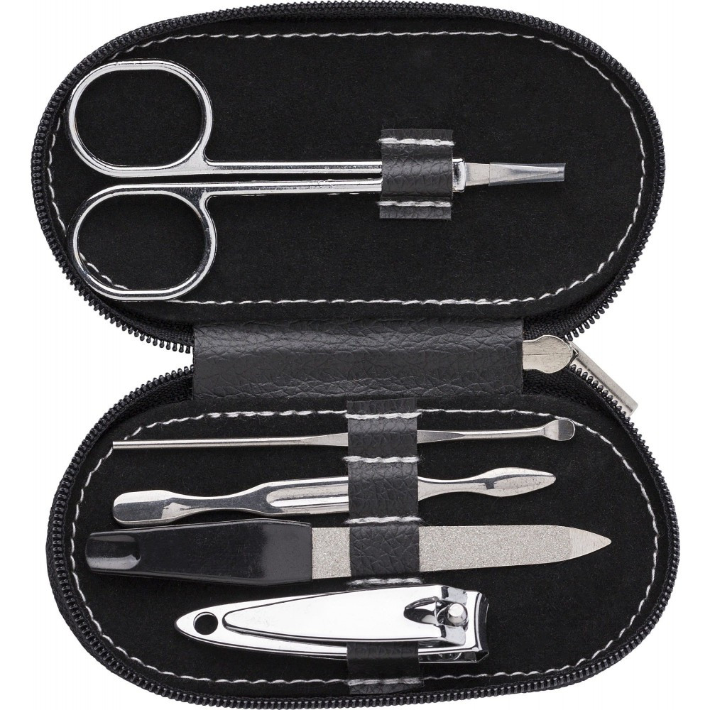 Manikűrkészlet PVC tokban. Tartalma: kisolló, körömreszelő, körömcsipesz, körömápoló eszközök.