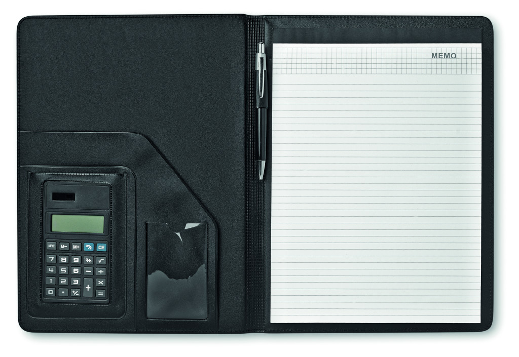 A4 műbőr mappa napelemes számológéppel. 20 oldalas vonalas jegyzettömb. Fém golyóstoll. Kéken író betéttel.