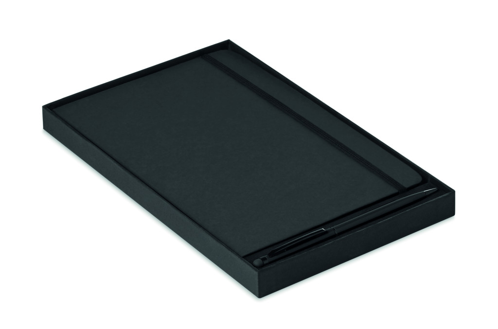 A5 jegyzetfüzet érintőhegyes golyóstollal, keménytáblás borítóval. Cérnafűzött. 144 vonalas oldal (72 lap). Fekete elasztikus zárópánt és könyvjelző szalag. Színben illeszkedő érintőhegyes golyóstoll, kéken író betéttel.