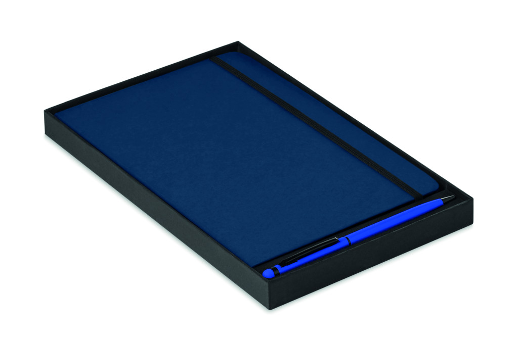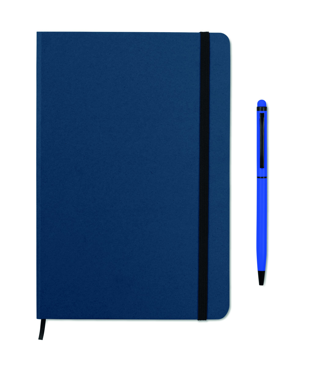 A5 jegyzetfüzet érintőhegyes golyóstollal, keménytáblás borítóval. Cérnafűzött. 144 vonalas oldal (72 lap). Fekete elasztikus zárópánt és könyvjelző szalag. Színben illeszkedő érintőhegyes golyóstoll, kéken író betéttel.
