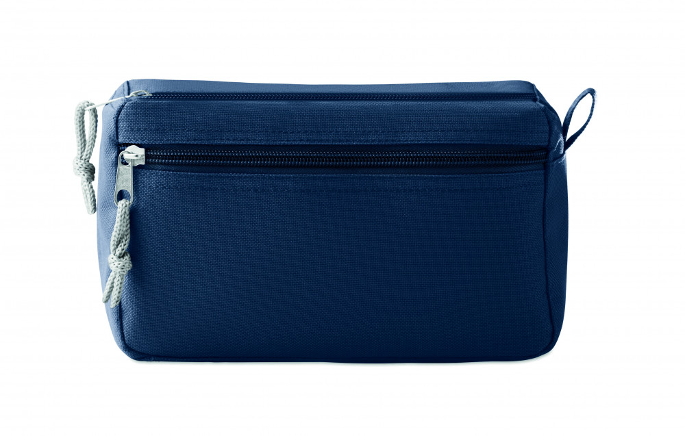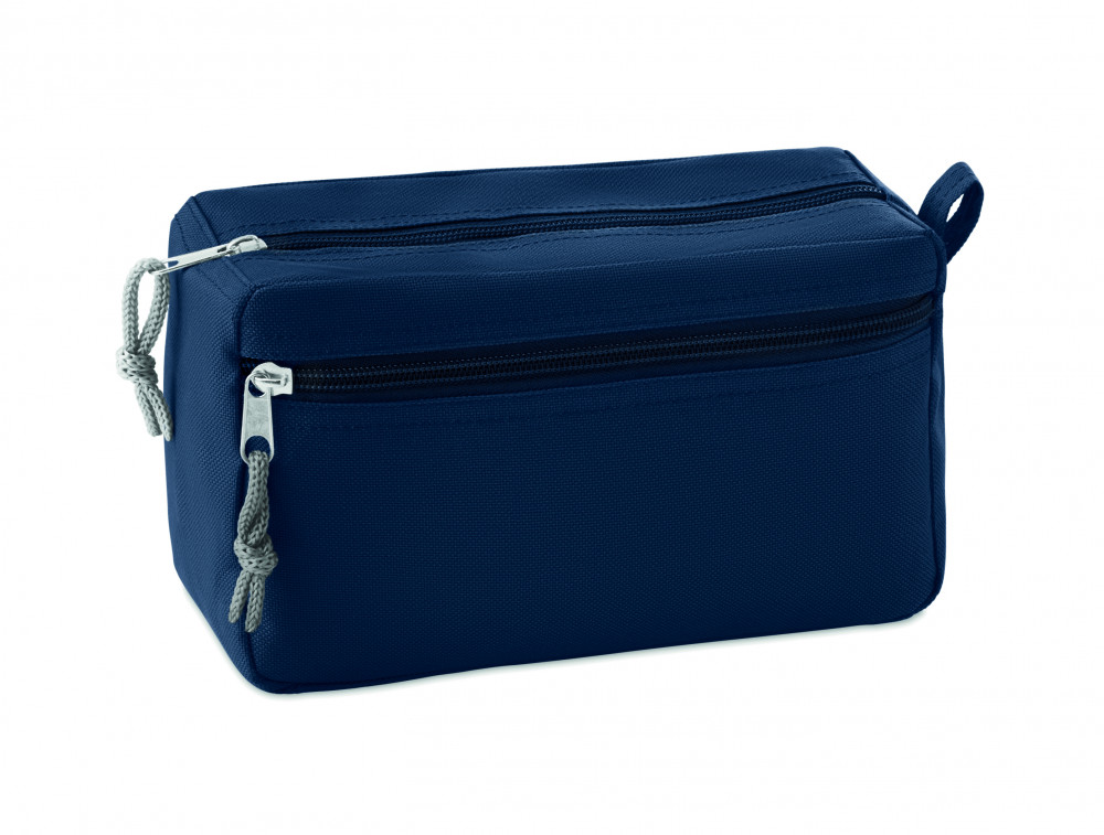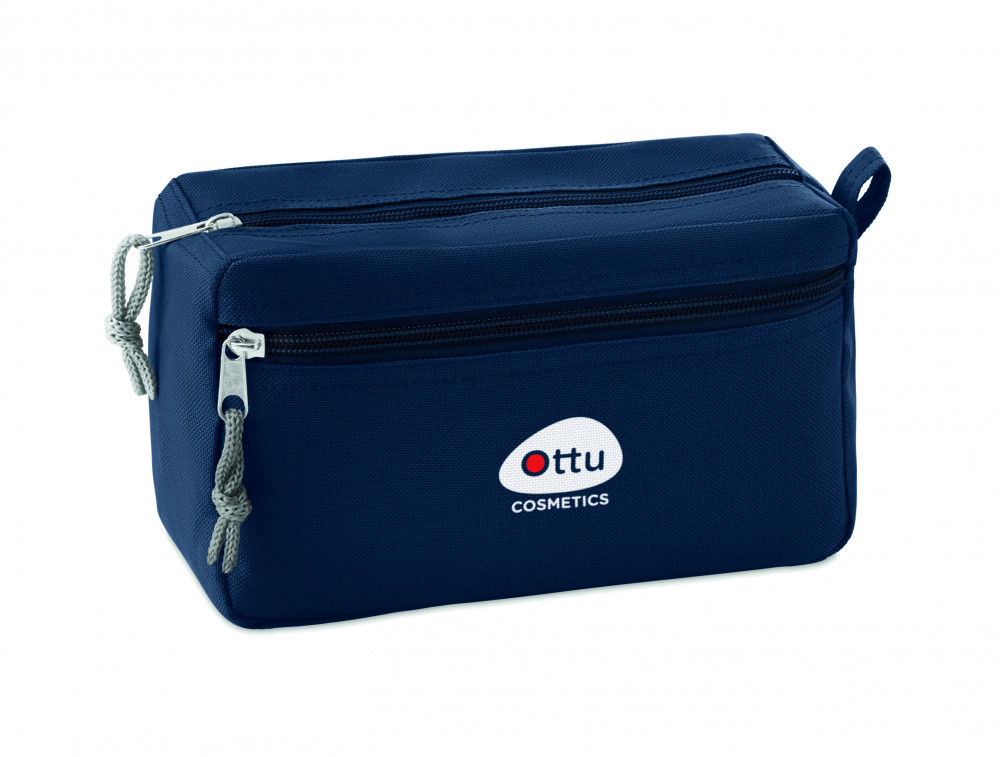 600D poliészter kozmetikai táska az oldalán cipzáras zsebbel. TPE belső borítással.