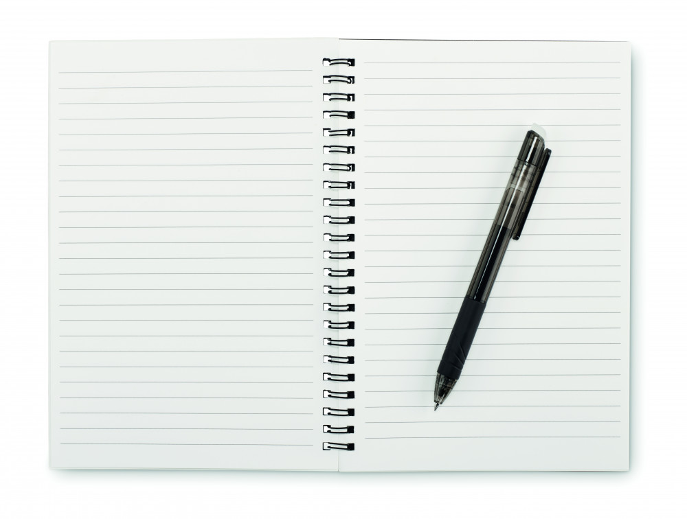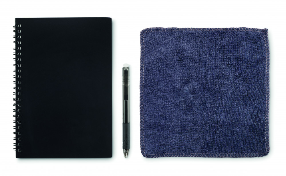A5 többször felhasználható jegyzetfüzet PP borítóval. 36 vonalas oldal (18 lap) újrahasznosított papírból. Kompatibilis bármely dokumentumszkennelő alkalmazással. Vízzel törölhető tollal és tisztító kendővel.