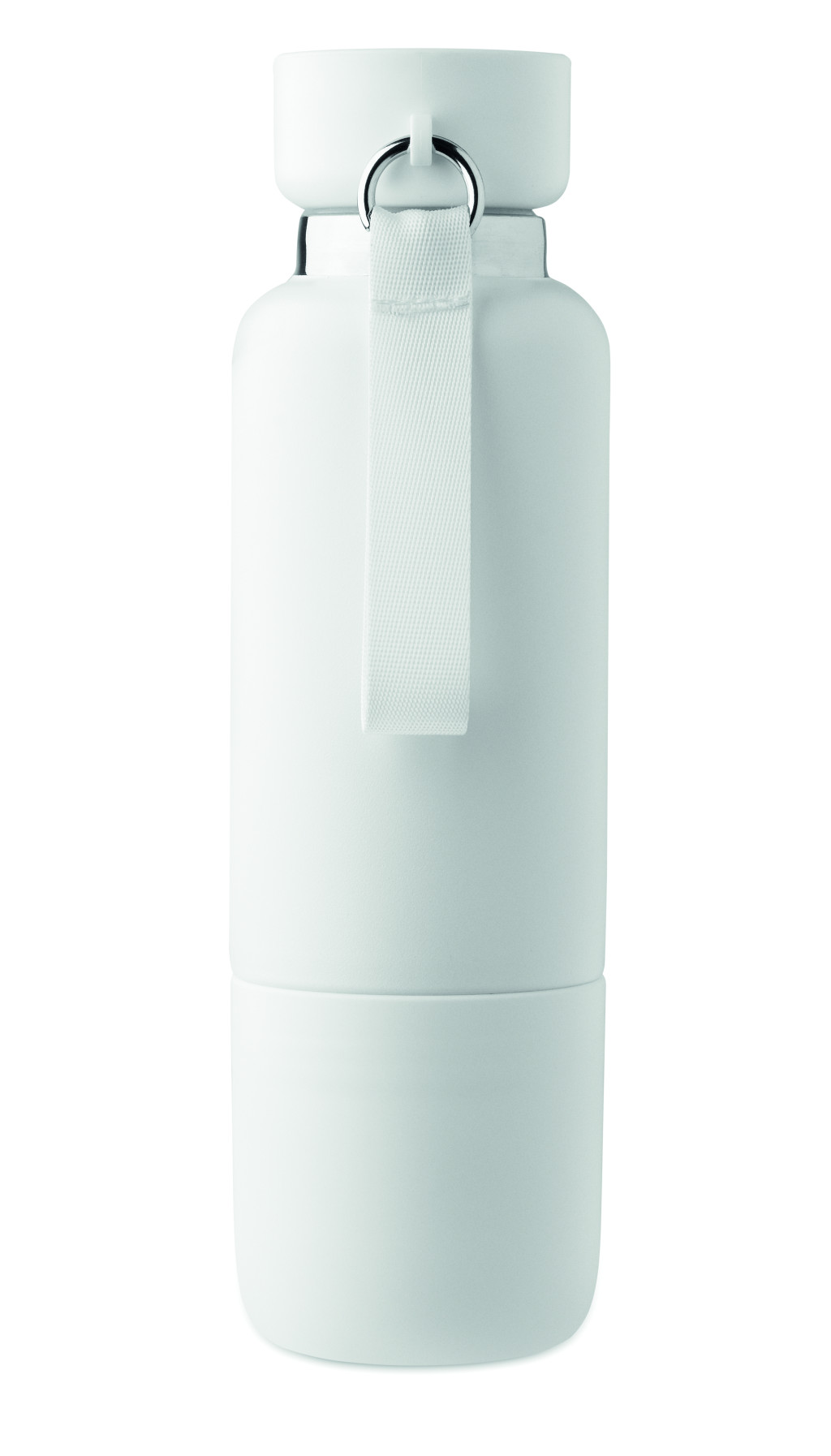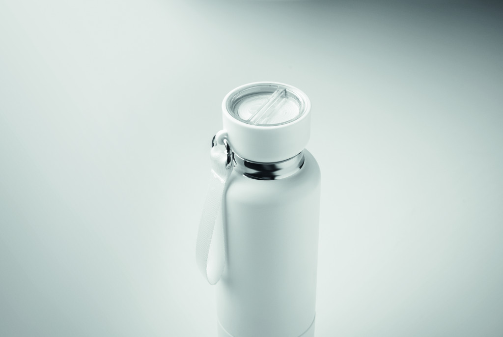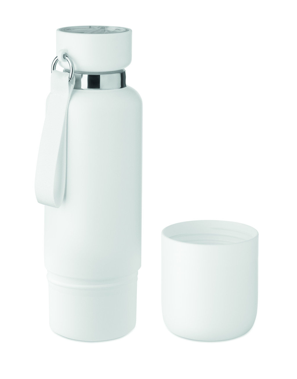 Duplafalú termoszpalack újrahasznosított rozsdamentes acélból (90% újrahasznosított rozsdamentes acél és 10% rozsdamentes acél), integrált hordpánttal és további hosszú pánttal (70 cm) a PP fedélben. Szivárgásmentes. Az alján pohárral. Űrtartalom: 500 ml.