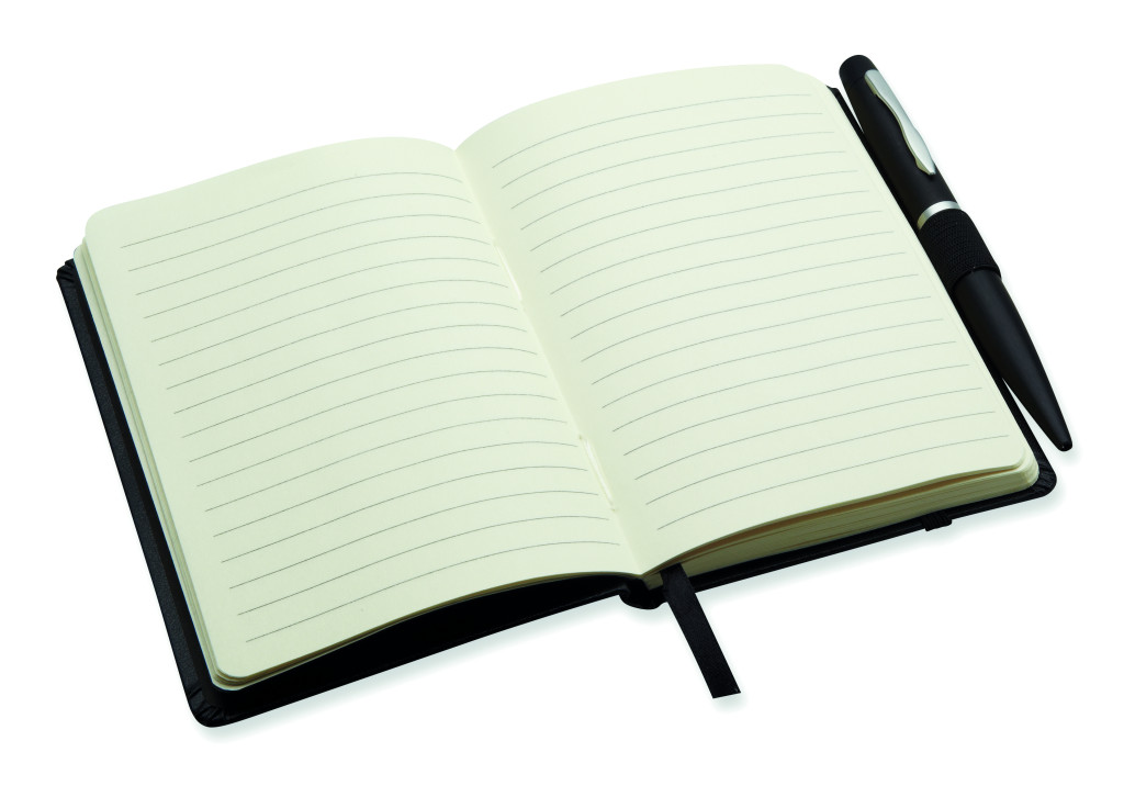 A6 jegyzetfüzet golyóstollal. PU keménytáblás borítóval. Cérnafűzött. 144 vonalas oldal (72 lap). Színben illeszkedő elasztikus zárópánt, tolltartó hurok és könyvjelző szalag. Fém nyomógombos golyóstoll, kéken író betéttel.