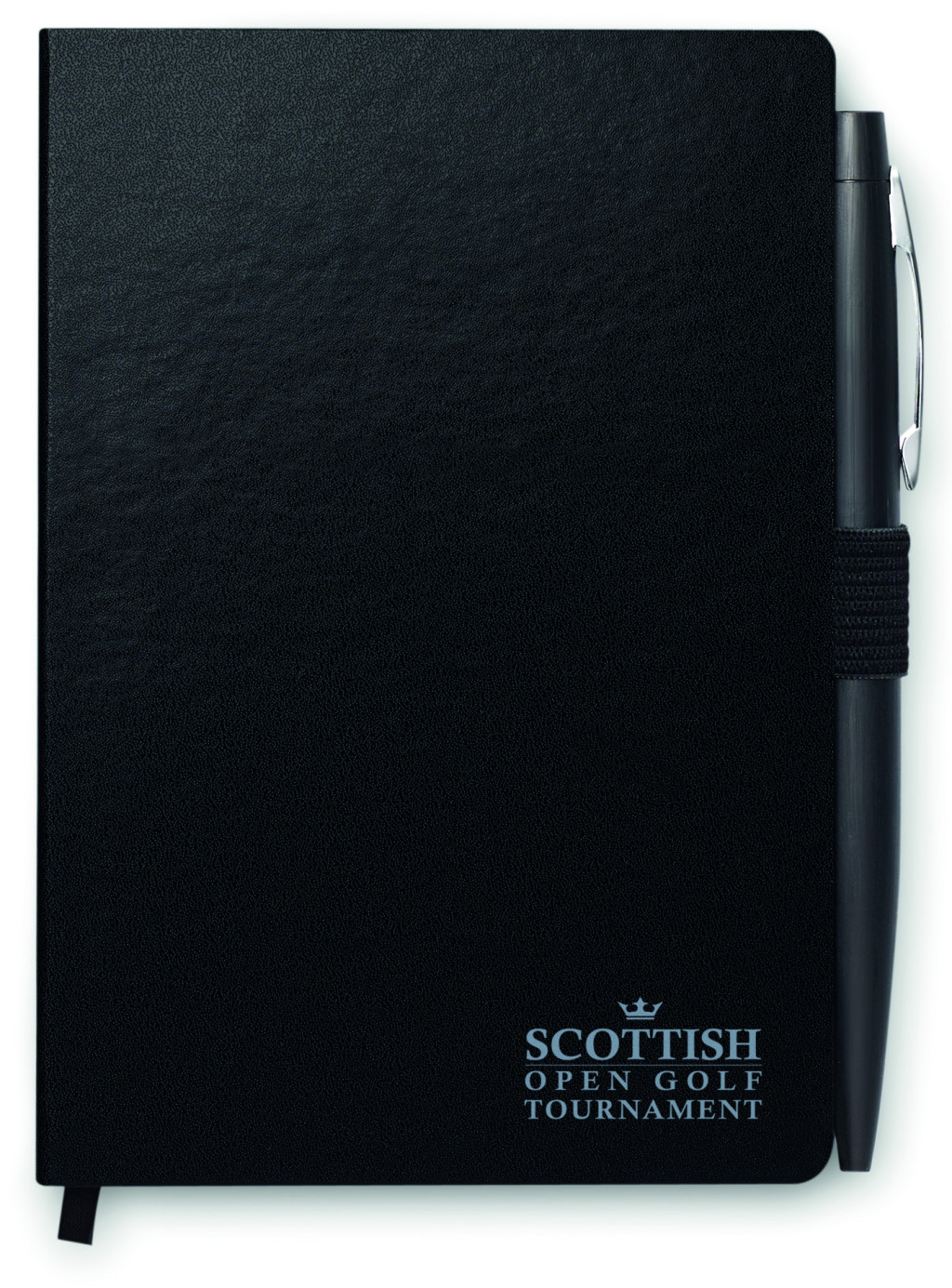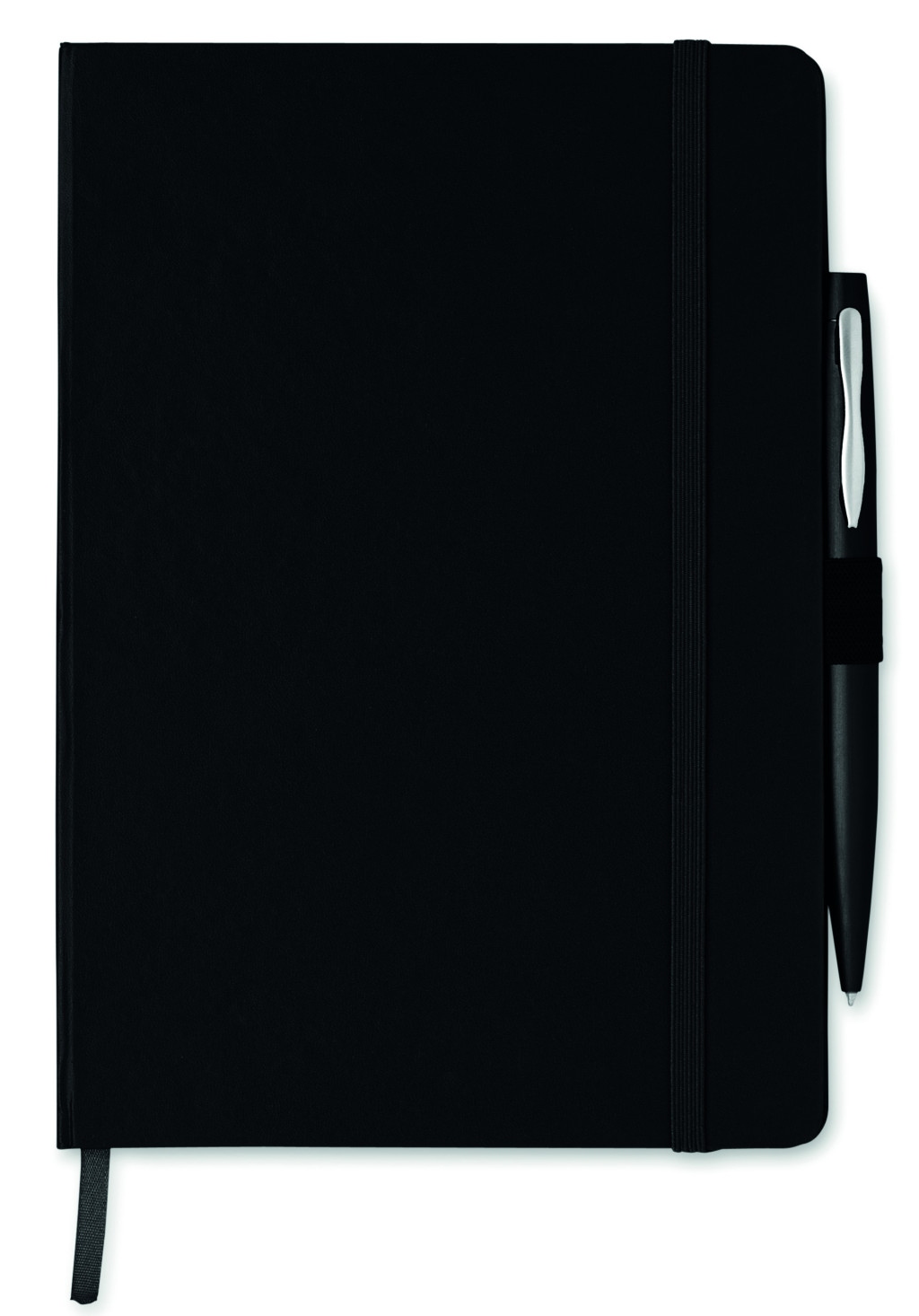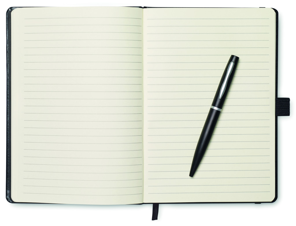 A5 jegyzetfüzet golyóstollal. PU keménytáblás borítóval. Cérnafűzött. 144 vonalas oldal (72 lap). Színben illeszkedő elasztikus zárópánt, tolltartó hurok és könyvjelző szalag. Fém nyomógombos golyóstoll, kéken író betéttel.