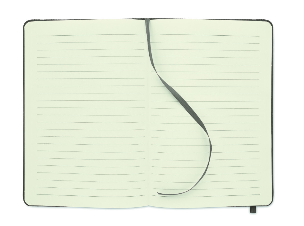 A5 jegyzetfüzet 600D RPET keménytáblás borítóval. Cérnafűzött. 160 vonalas oldal (80 lap) újrahasznosított papírból. Hozzáillő elasztikus zárópánt és könyvjelző szalag. FSC®-certified | FSC MIX CREDIT, P7.1, FSC-C213206