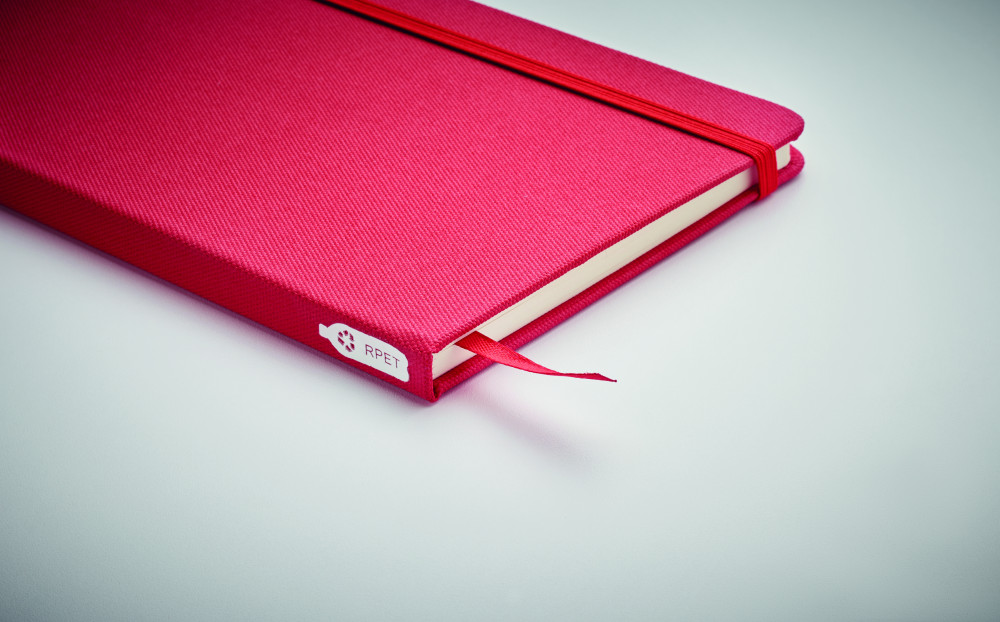 A5 jegyzetfüzet 600D RPET keménytáblás borítóval. Cérnafűzött. 160 vonalas oldal (80 lap) újrahasznosított papírból. Hozzáillő elasztikus zárópánt és könyvjelző szalag. FSC®-certified | FSC MIX CREDIT, P7.1, FSC-C213206