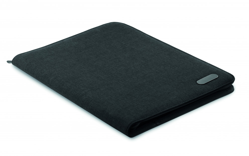A4 konferenciamappa melírozott színű poliészterből. Cipzárral. 20 oldalas vonalas jegyzettömb. 3 rekesz. Tolltartó hurok.