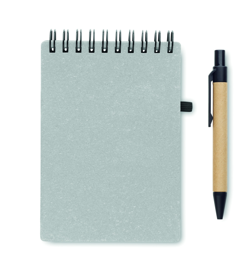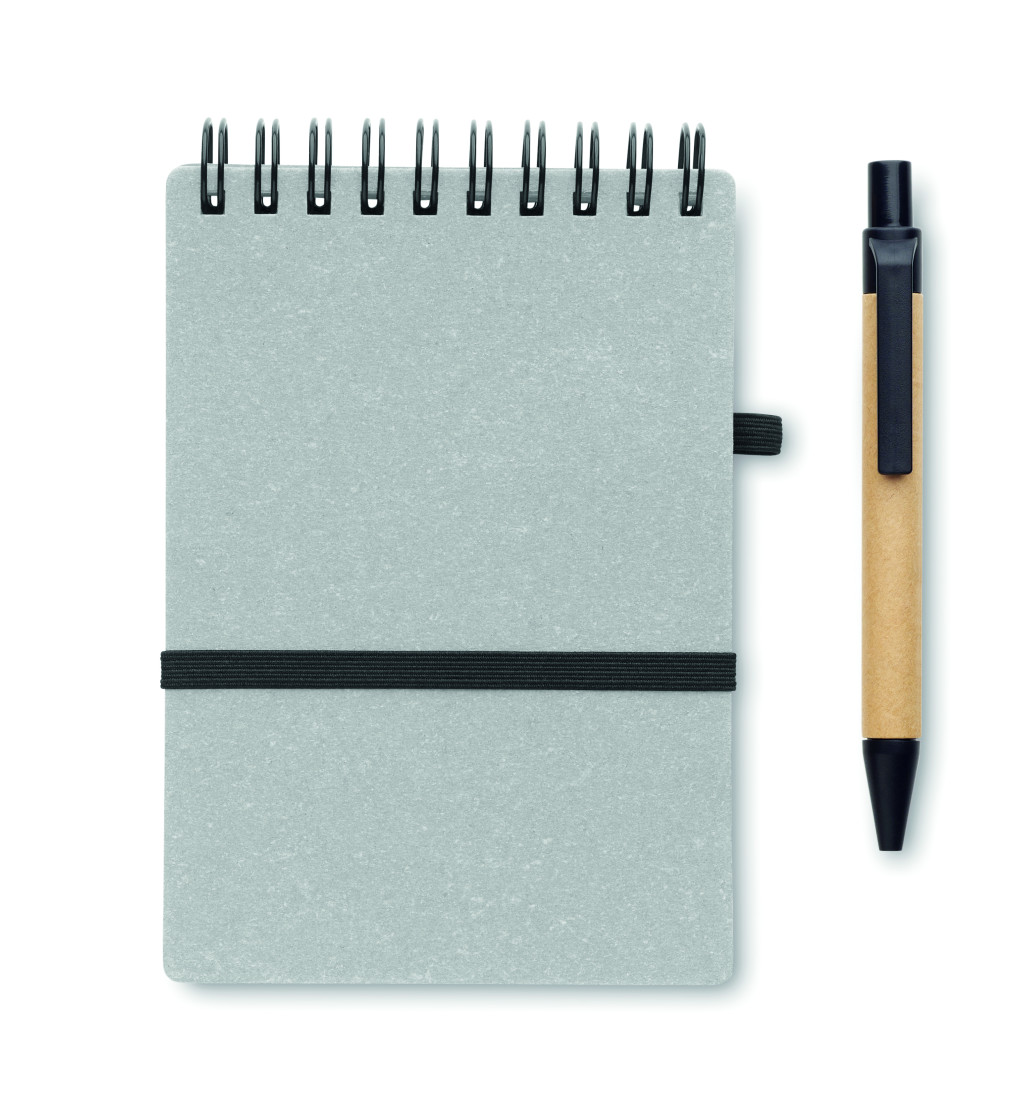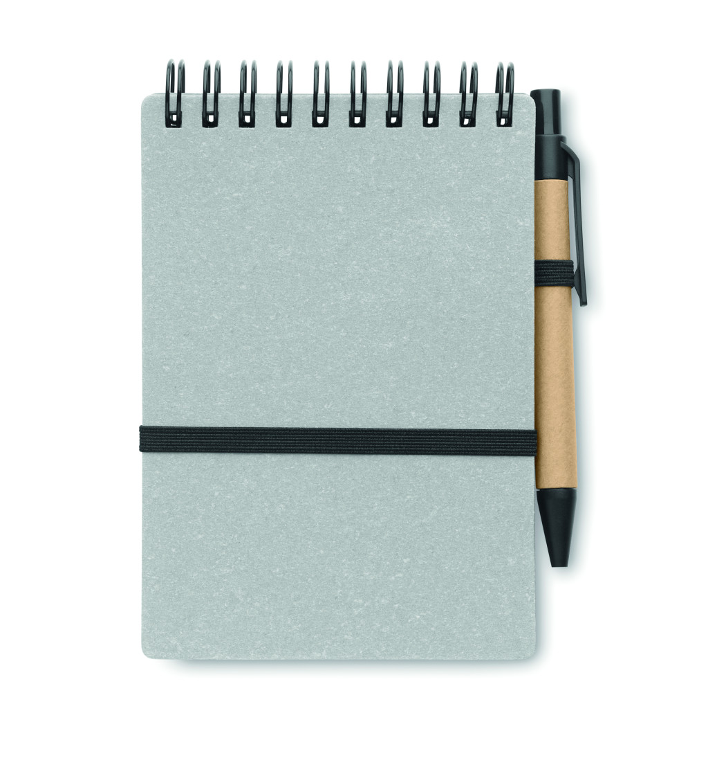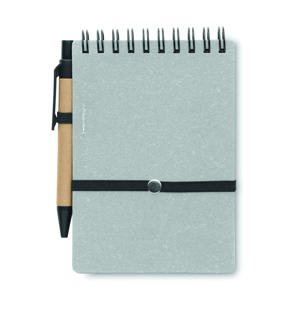 B7 újrahasznosított papír és PU borítós (70% újrahasznosított papír és 30% PU) jegyzetfüzet. Spirálozott. 140 vonalas, újrahasznosított papír oldal (70 lap). Színben illeszkedő nyomógombos golyóstoll, újrahasznosított papír tolltesttel, ABS szerelvényekkel. Kéken író betéttel. Elasztikus zárópánt és tolltartó hurok. FSC®-certified | FSC MIX CREDIT, P7.1, FSC-C213206
