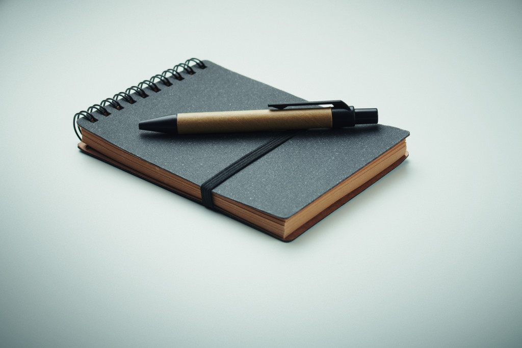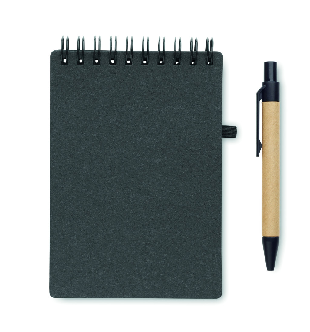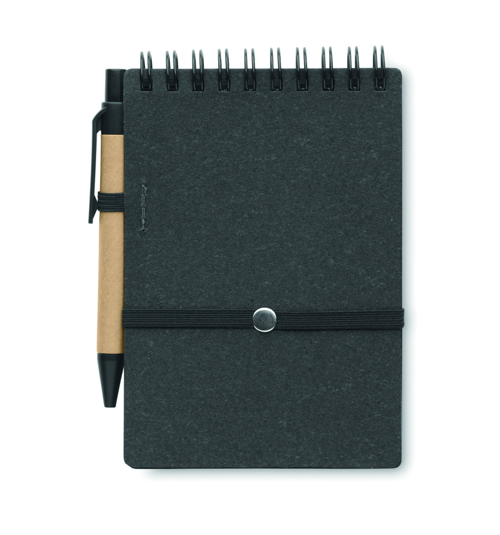 B7 újrahasznosított papír és PU borítós (70% újrahasznosított papír és 30% PU) jegyzetfüzet. Spirálozott. 140 vonalas, újrahasznosított papír oldal (70 lap). Színben illeszkedő nyomógombos golyóstoll, újrahasznosított papír tolltesttel, ABS szerelvényekkel. Kéken író betéttel. Elasztikus zárópánt és tolltartó hurok. FSC®-certified | FSC MIX CREDIT, P7.1, FSC-C213206