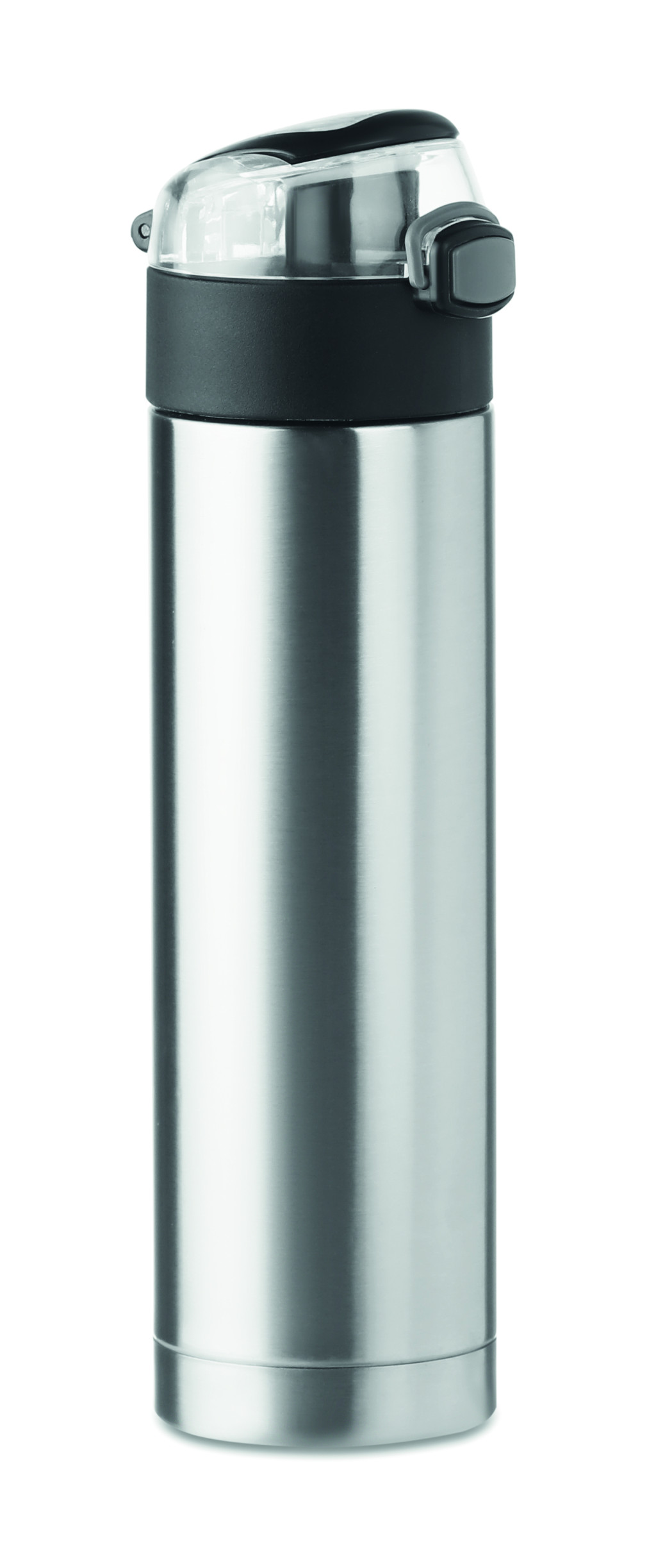 Rozsdamentes acélból készült, duplafalú palack a kupakon biztonsági zárral. Nyomógombbal nyitható. A tetején lévő lehajtható fogantyúval könnyen szállítható. 400 ml űrtartalom. Szivárgásmentes.