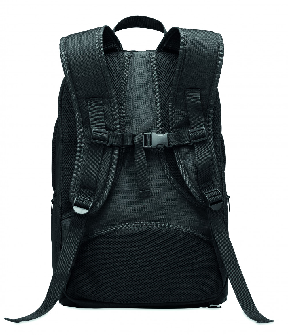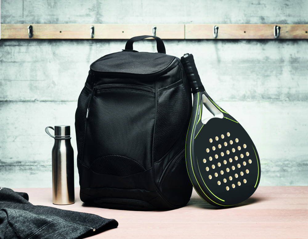 600D RPET többfunkciós sport hátitáska több rekesszel, többek között padel ütő tárolására alkalmas párnázott résszel, valamint állítható vállpánttal.