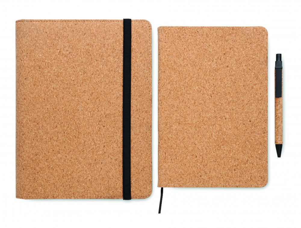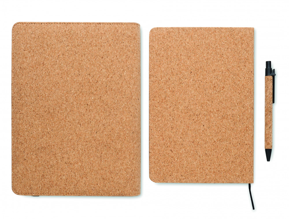 A5 parafa mappa. Cserélhető A5 jegyzetfüzet parafa keménytáblás borítóval. Cérnafűzött. 192 vonalas, újrahasznosított papír oldal (96 lap). Illeszkedő színű toll és tolltartó hurok. 2 kártyatartó és egy nagy rekesz. Elasztikus zárópánt.