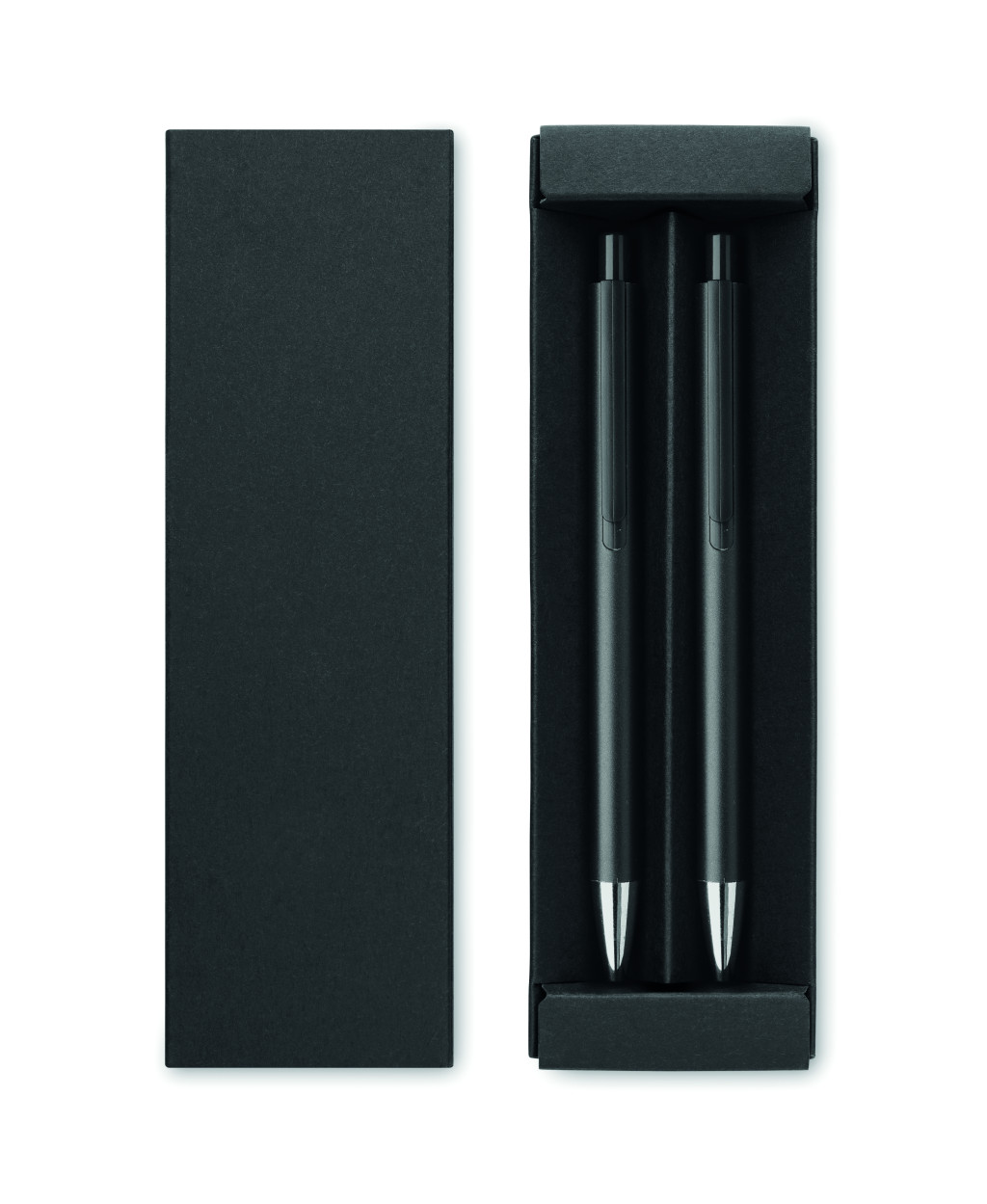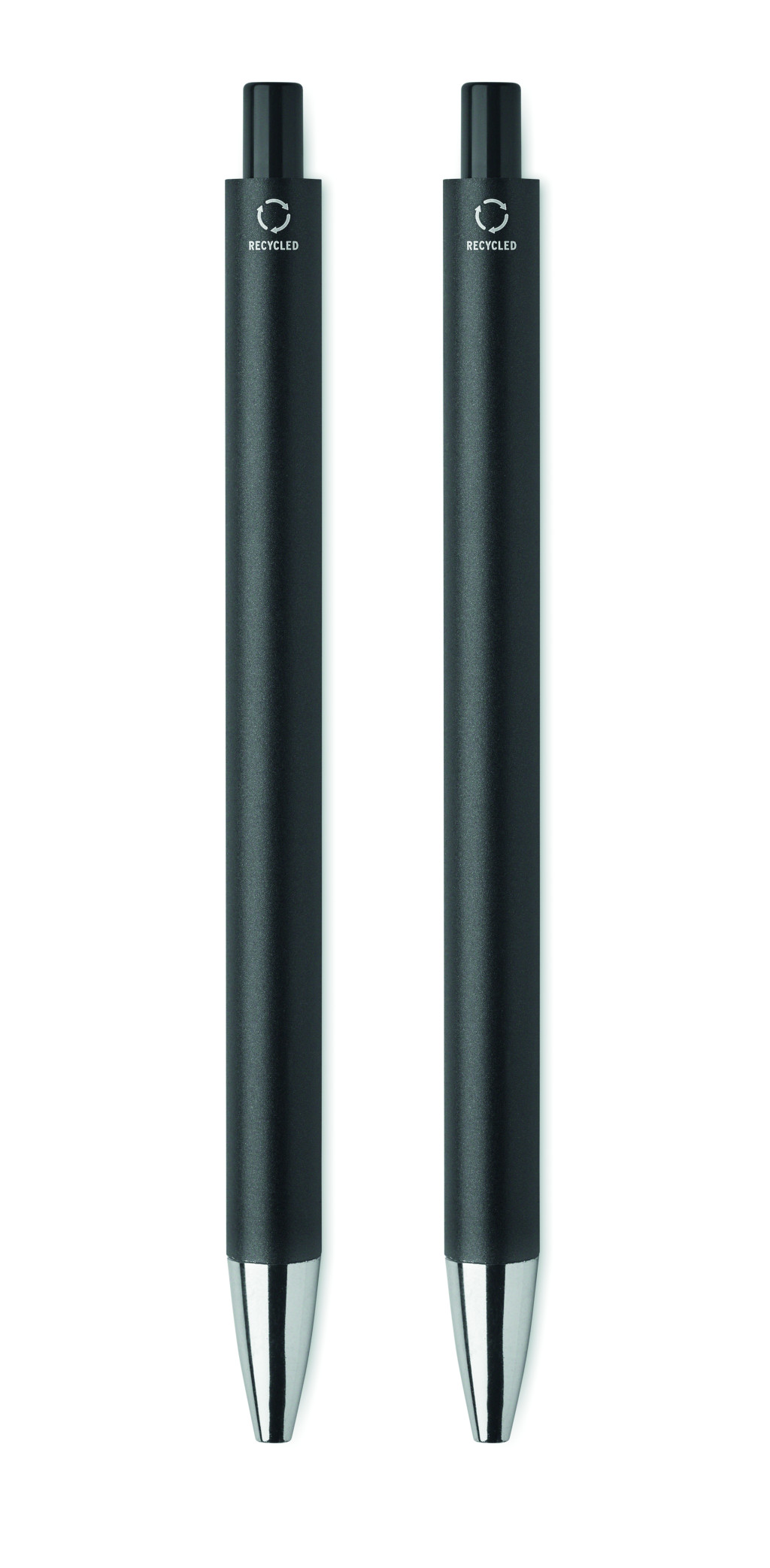 Újrahasznosított alumínium tollkészlet, golyóstollal és grafit, tintamentes tollal. Kéken író betéttel. Újrahasznosított papírdobozban.