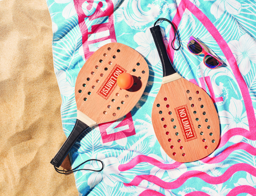 Strandtenisz szett. Tartalmaz 2 db rózsafából készült, PU nyélvédő szalagos ütőt és 1 puha labdát. Pamut hordtasakban szállítjuk. FSC®-certified | FSC 100%, N5.7, FSC-C213206