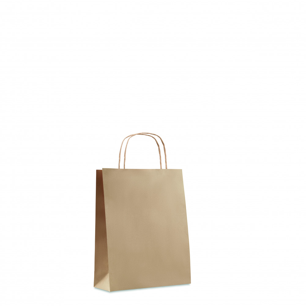 Kis papír ajándéktasak. Egy papírtáska remek módja az ajándék tetszetős csomagolásának és átadásának. Kisebb tárgyak esetén akár hordtáskaként is használható. 90 g. vastag papírból. FSC®-certified | FSC MIX, P5.3, FSC-C213206
