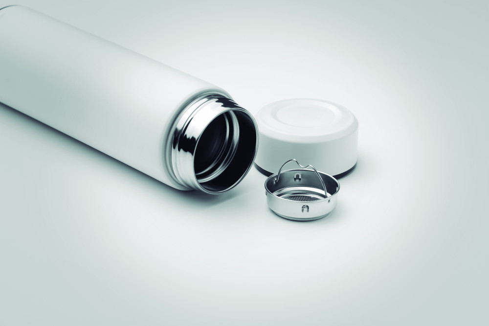 Duplafalú, rozsdamentes acél termosz teaszűrővel. Űrtartalom 425 ml. Szivárgásmentes.