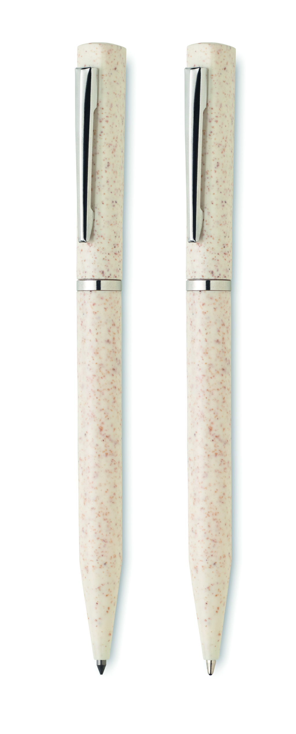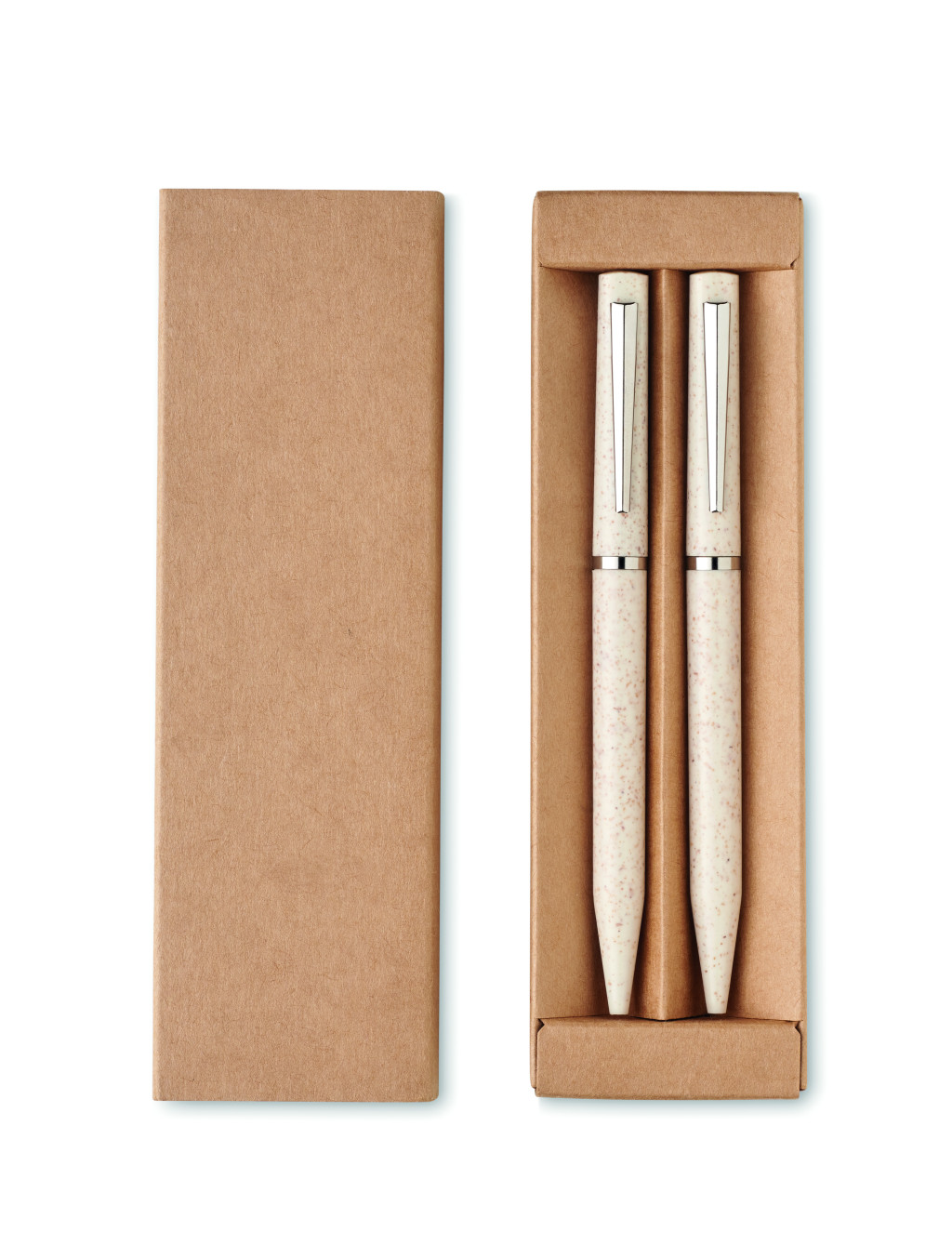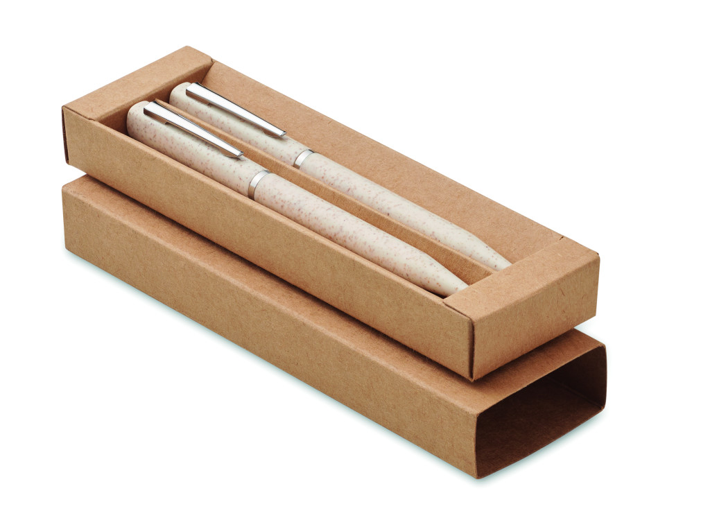 Búzaszalma/ABS tollkészlet csavarzáras, kéken író golyóstollal és csavarzáras, grafit, tintamentes golyóstollal. Újrahasznosított papírdobozban. FSC®-certified | FSC MIX, P5.1, FSC-C213206