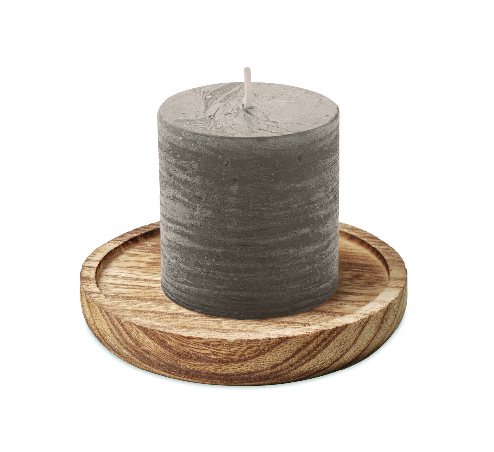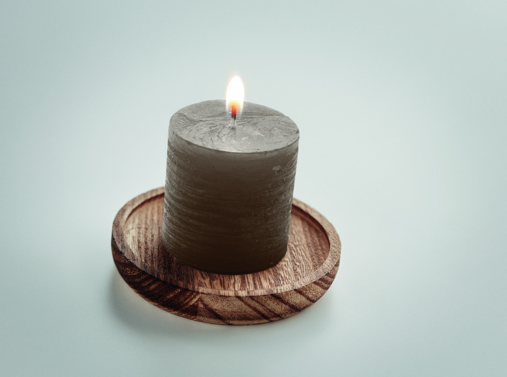 88gr Kerek formájú, fából készült dekoratív tartó vanília illatú gyertyával.