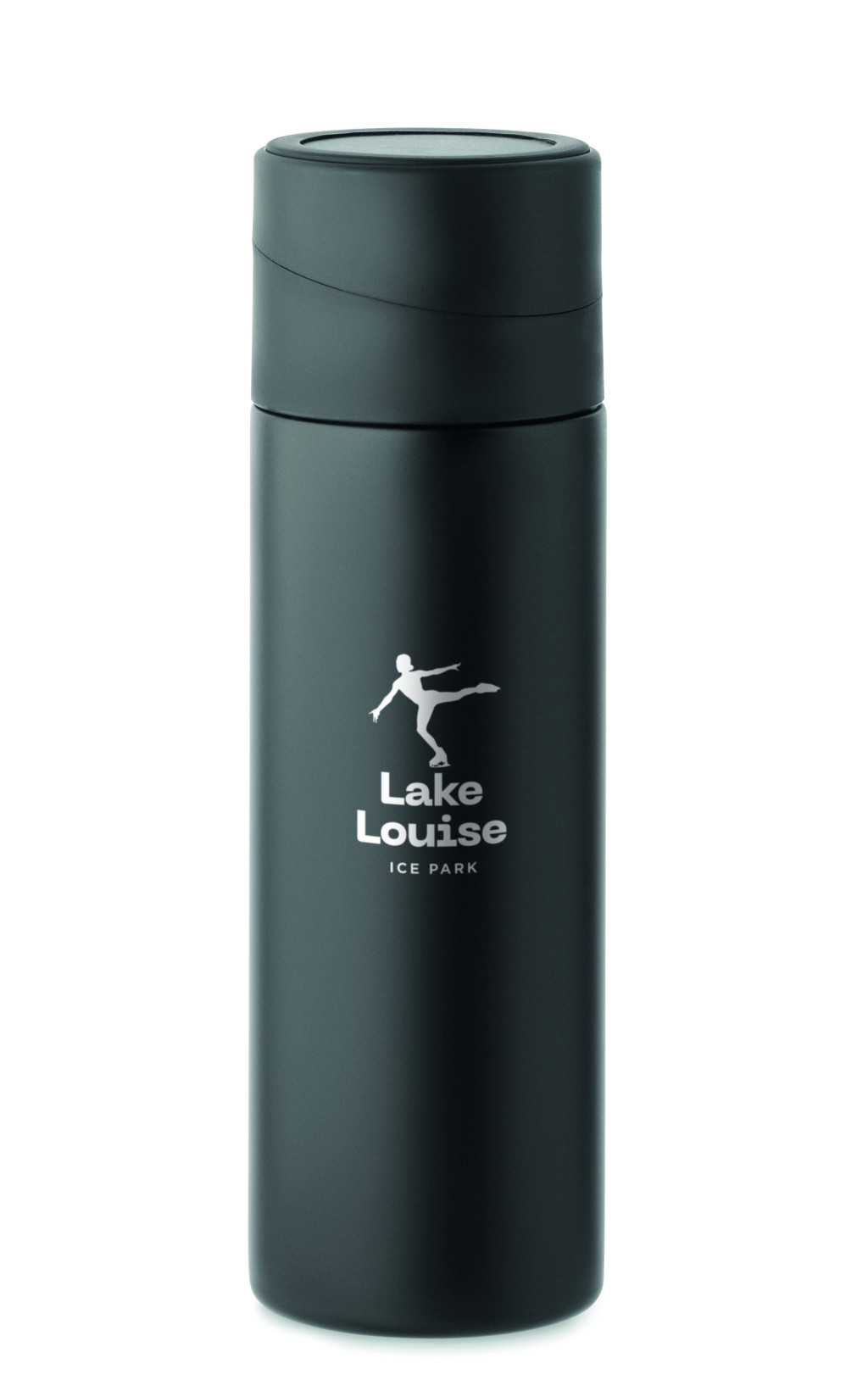 Duplafalú termoszpalack újrahasznosított rozsdamentes acélból (90% újrahasznosított rozsdamentes acél és 10% rozsdamentes acél), szilikon csúszásmentes telefontartó gyűrűvel a fedélen. Szivárgásmentes. Űrtartalom: 420 ml.