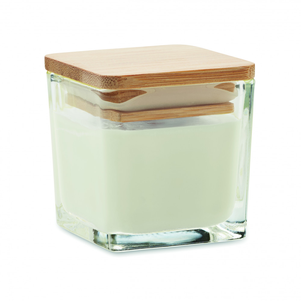 Illatosított növényi alapú viaszgyertya szögletes üvegtartóban, bambuszfedéllel. 50 g. Égési idő: 8 óra. Aroma: fehér (06) vanília, sárga (08) citrom, narancs (10) narancs, zöld (48) alma.