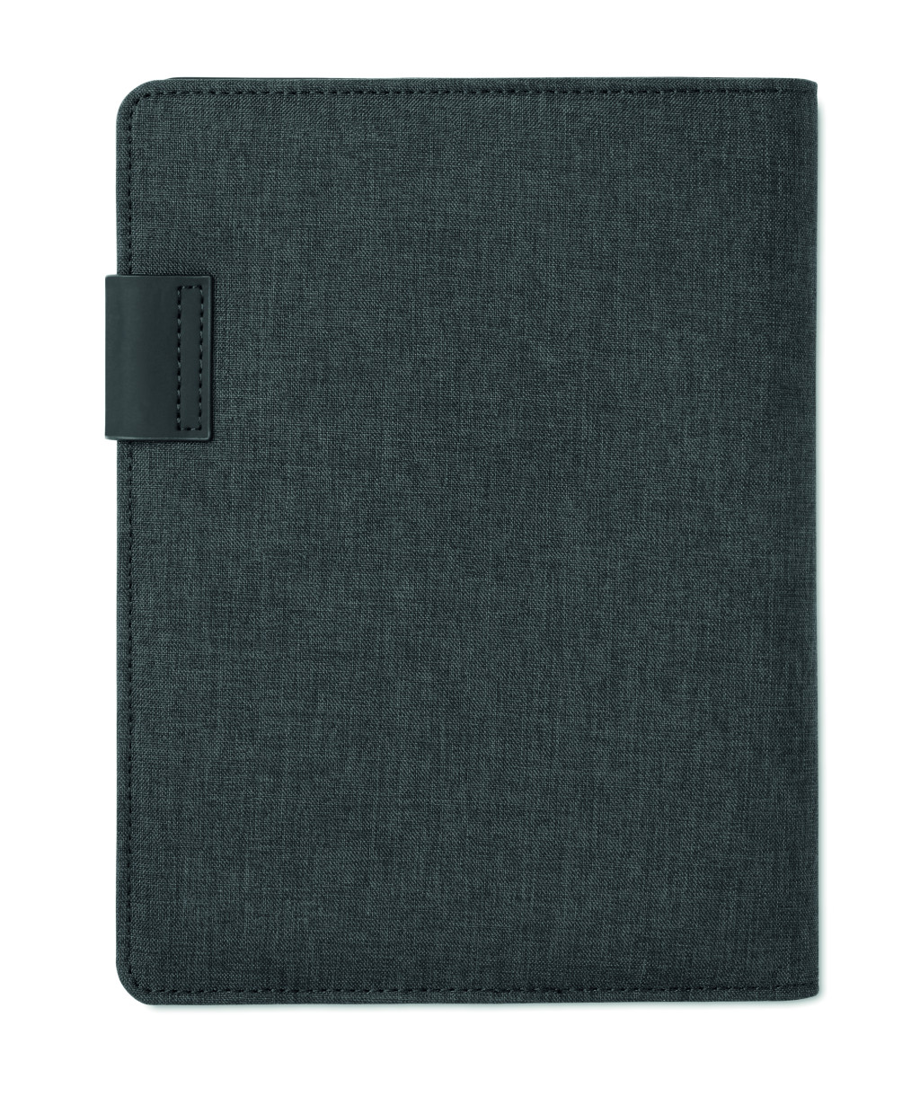 A5 konferenciamappa vászon és PU borítóval. 4000 mAh kapacitású külső akkumulátorral. Beépített USB és mikro USB csatlakozó. 20 vonalas lapos jegyzettömb. Több belső rekesz. Mágneses záródás. Elasztikus tolltartó.