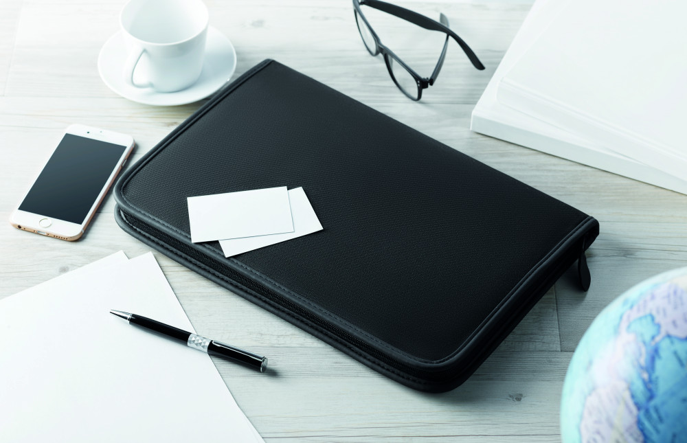 A4 cipzáras mappa 600D poliészterből, 210T béléssel. 20 oldalas vonalas A4 jegyzettömb újrahasznosított papírból. 4 külön rekesszel és kártyatartóval.
