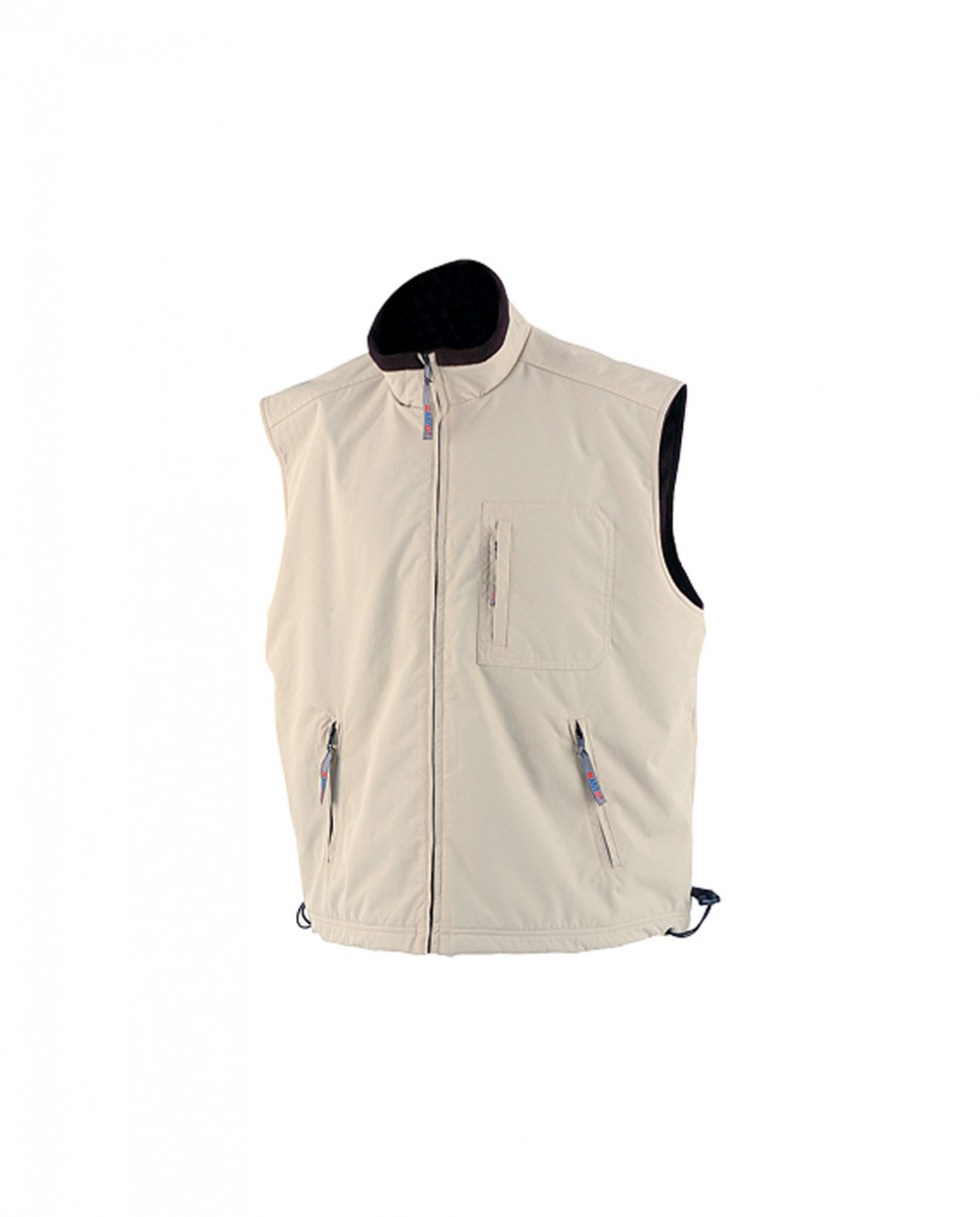100% poliészter, állógalléros, cipzáras mellény, kontrasztos színű polár belsővel. Elején és két oldalán cipzáras zsebbel. Mellény alja bősége gumizsinórral szabályozható. 280 g/m².