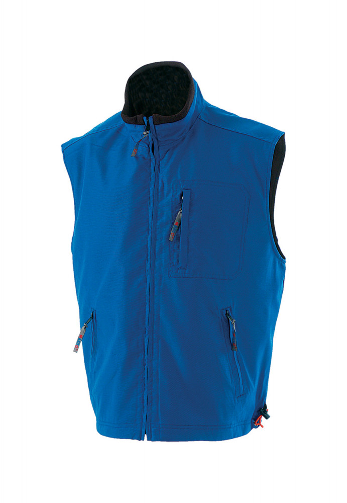 100% poliészter, állógalléros, cipzáras mellény, kontrasztos színű polár belsővel. Elején és két oldalán cipzáras zsebbel. Mellény alja bősége gumizsinórral szabályozható. 280 g/m².