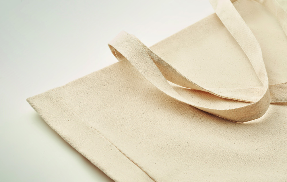 Újrahasznosított vászon bevásárlótáska vagy strandtáska hosszú füllel, oldalsó toldással. 50% pamut és 50% újrahasznosított pamut, 280 g vastag anyag.