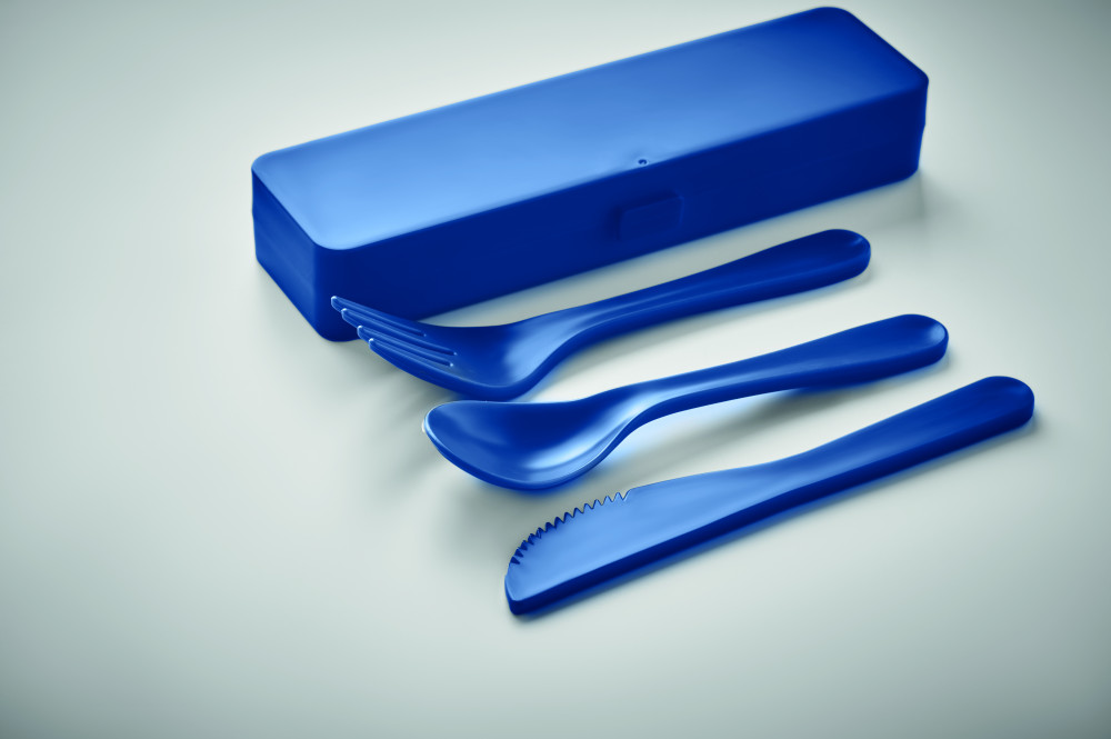 Többször használható PP hordozható evőeszközkészlet tokban. Kanalat, villát és kést tartalmaz.