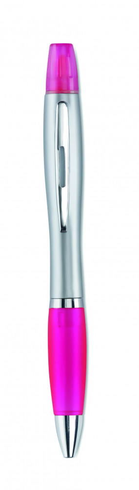 2 az 1-ben műanyag golyóstoll és szövegkiemelő ezüst szatén kivitelben, krómozott szerelvényekkel. Kéken író betéttel.