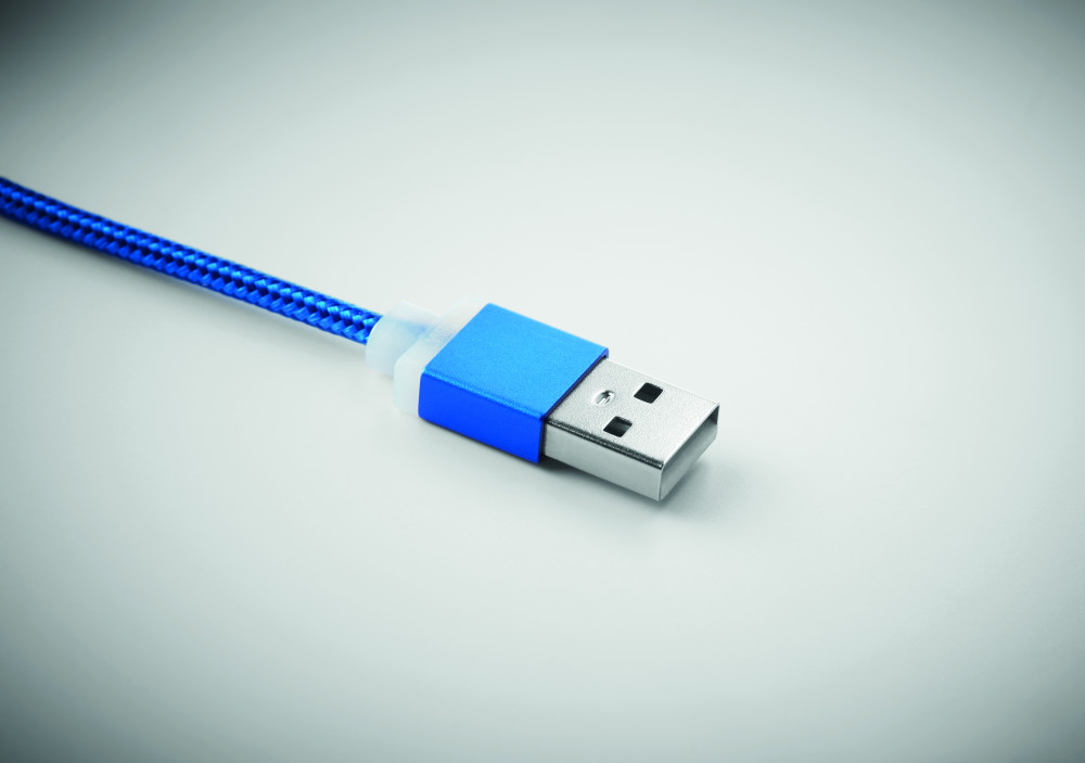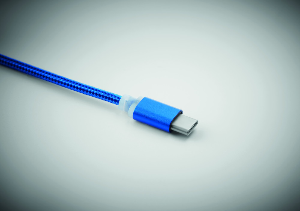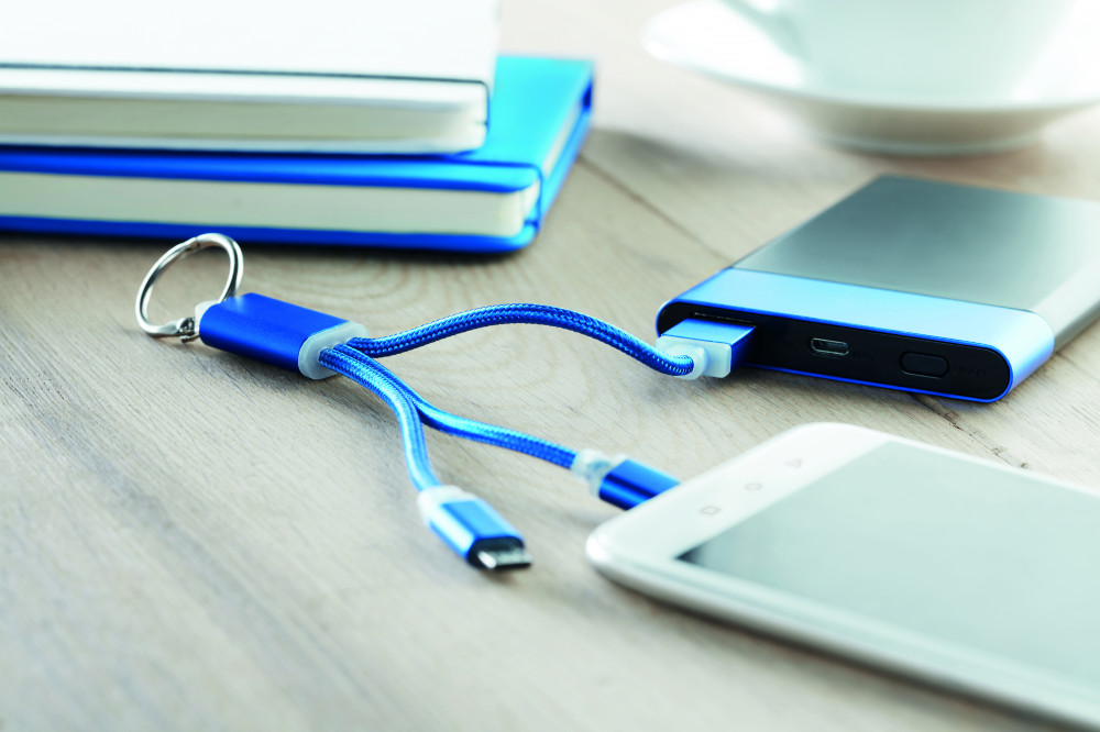 Kulcstartó borítással, USB-A, mikro-B és C típusú csatlakozókábellel.