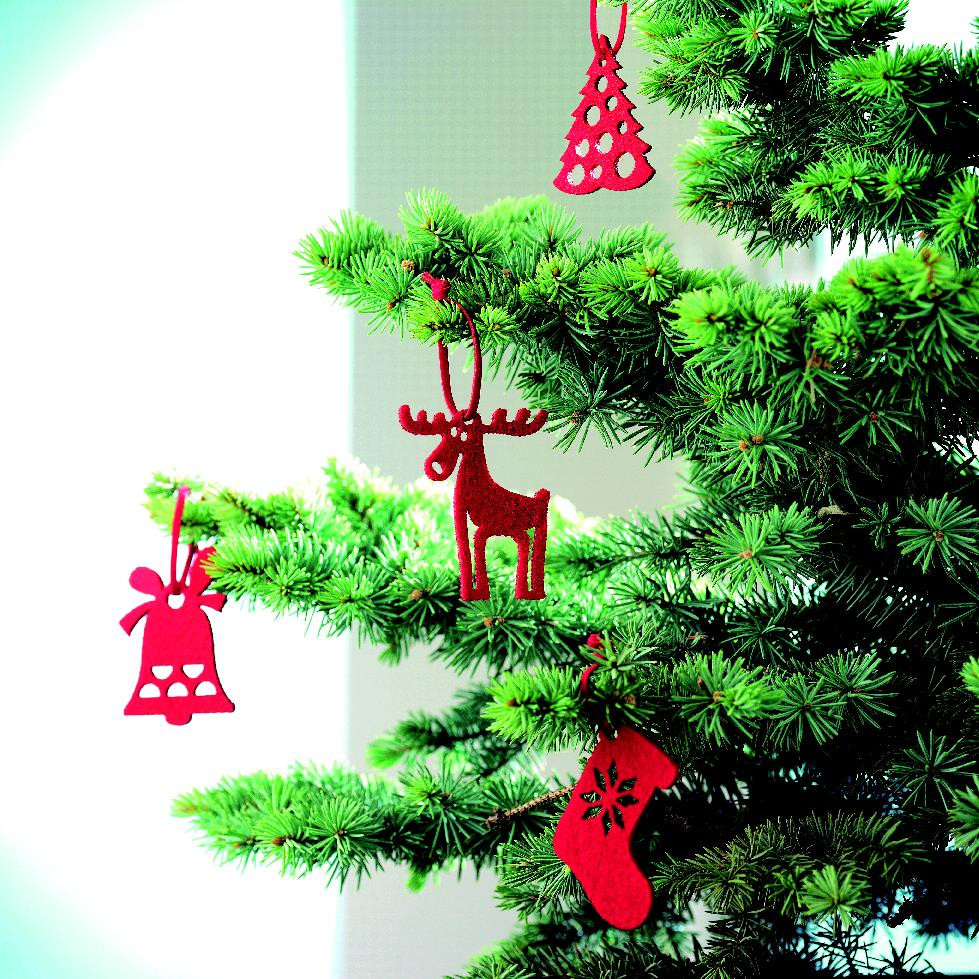 6 db különböző formájú piros karácsonyfadísz filc anyagból: fenyőfa, hópehely, harang, csizma, mikulásvirág és rénszarvas.