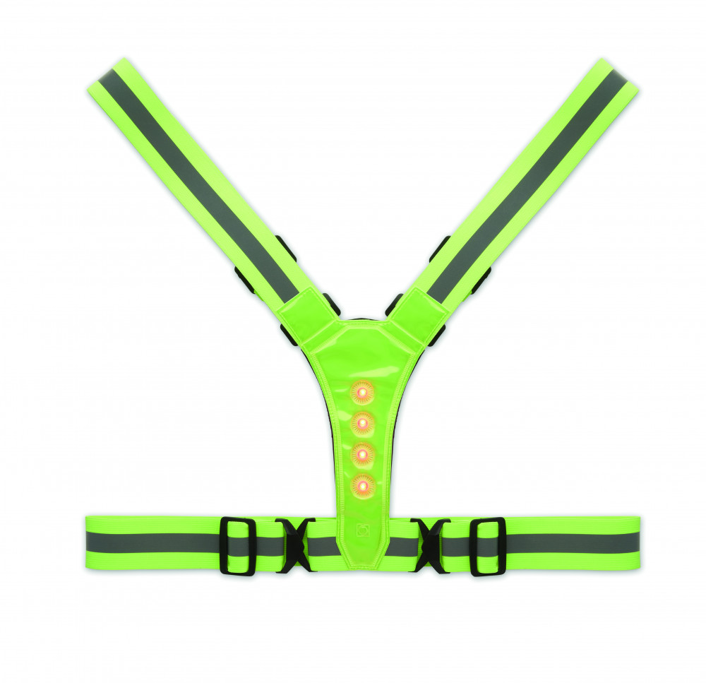 Állítható 360°-os, fényvisszaverő láthatósági kantár, ezüst csíkokkal, az elején és a hátoldalán egyaránt 4-4 LED lámpával. A működéshez szükséges 2 db CR2032 elemmel szállítjuk. Csak promóciós célra.