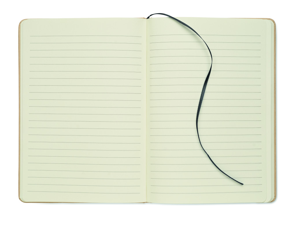 A5 jegyzetfüzet keménytáblás, újrahasznosított karton borítóval. Cérnafűzött. 160 vonalas oldal (80 lap) újrahasznosított papírból. Elasztikus zárópánt és könyvjelző szalag, melyek színe a gravírozás után, a bézs borító réteg alól megjelenő színhez illeszkedik. FSC®-certified | FSC MIX CREDIT, P7.1, FSC-C213206