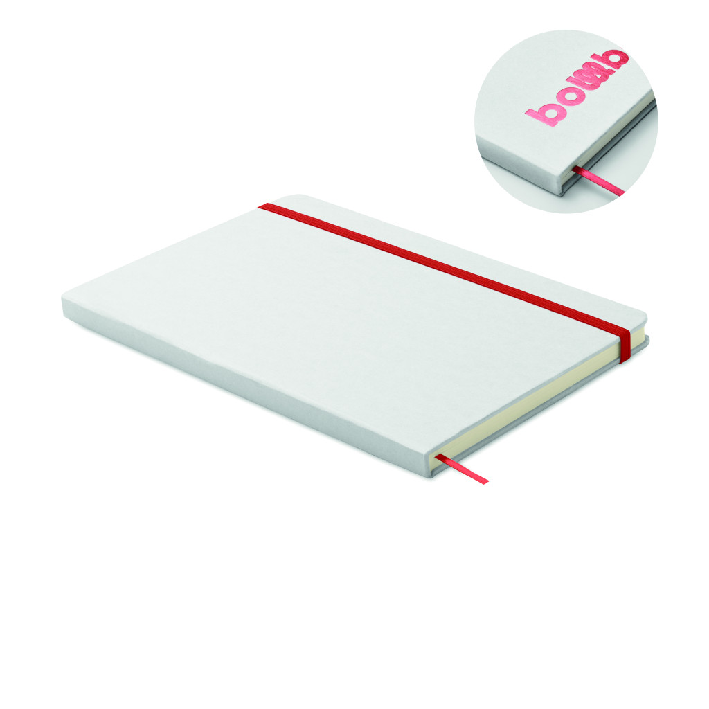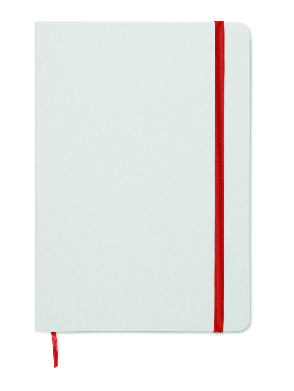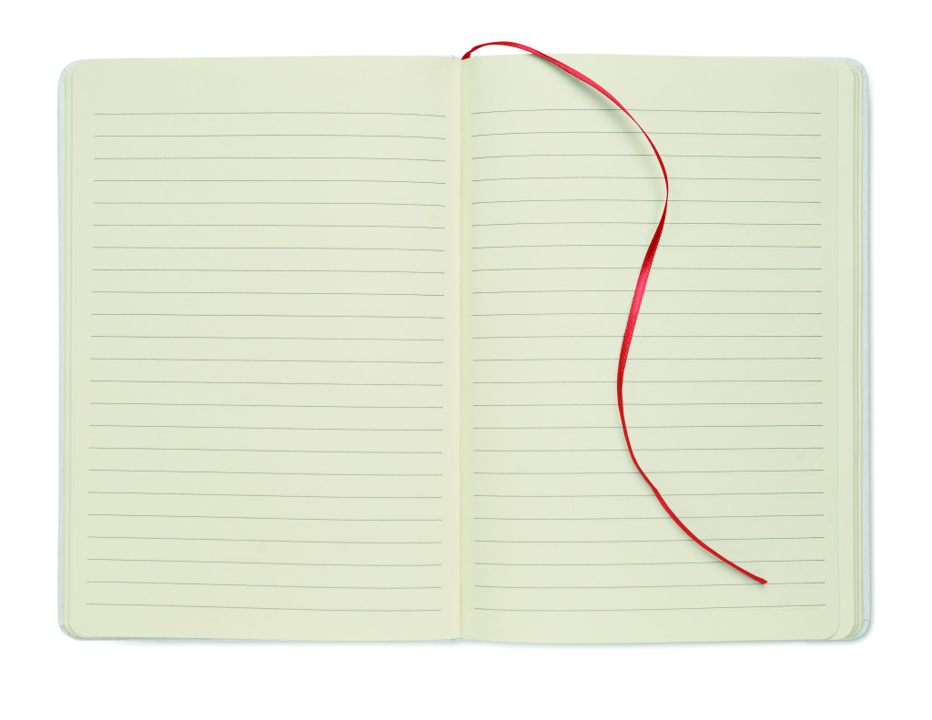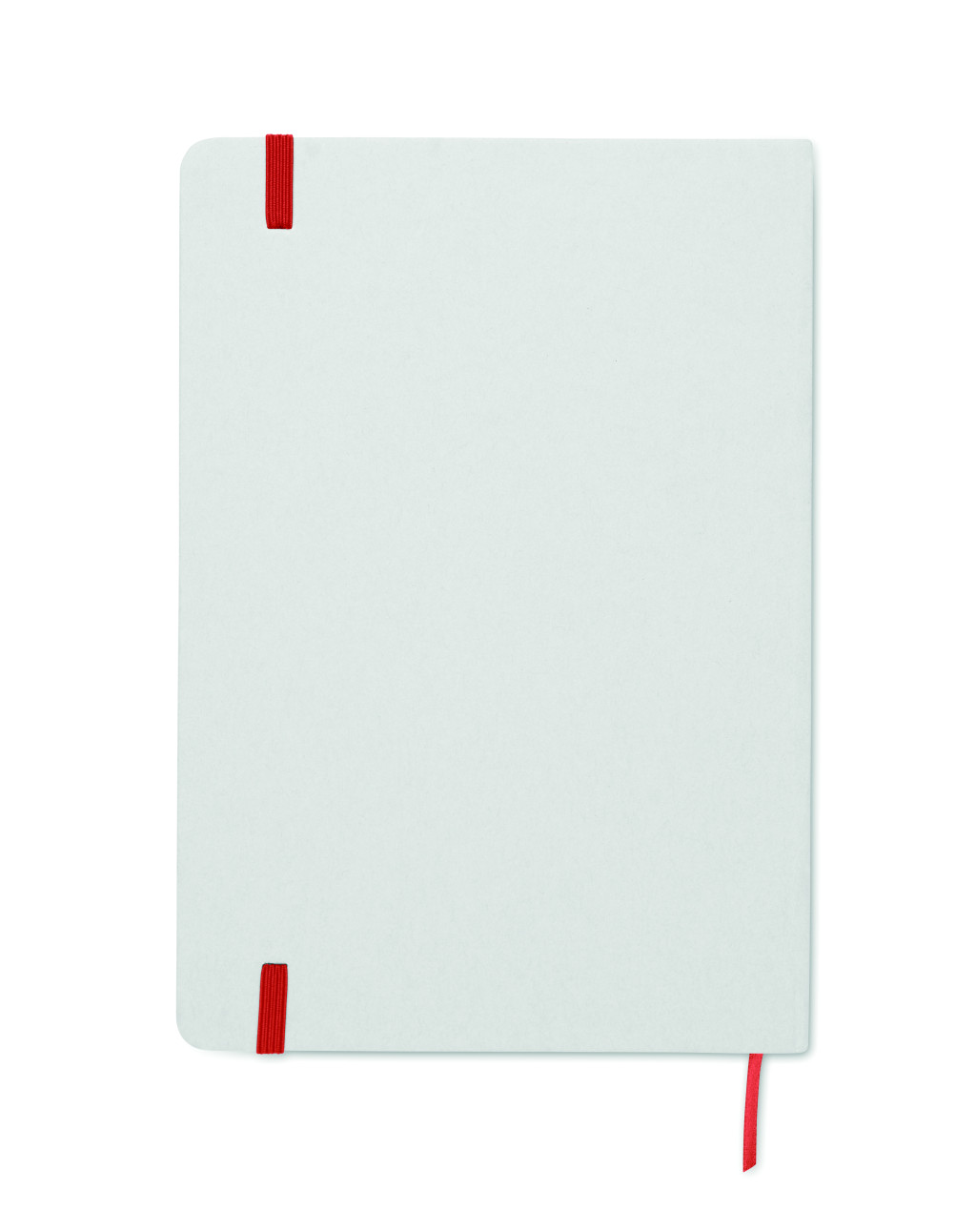 A5 keménytáblás jegyzetfüzet, 70%-ban újrahasznosított tejesdoboz csomagolásból és 30%-ban újrahasznosított papírból készült borítóval. Cérnafűzött. 160 vonalas oldal (80 lap) újrahasznosított papírból. Elasztikus zárópánt és könyvjelző szalag, melyek színe a gravírozás után, a fehér borító réteg alól megjelenő színhez illeszkedik.