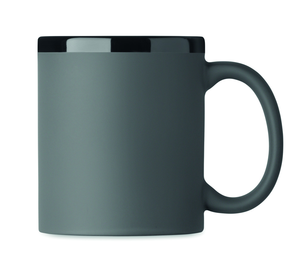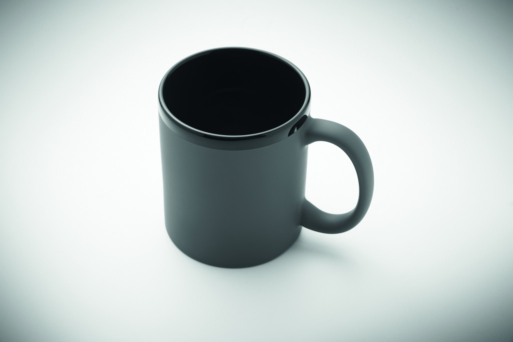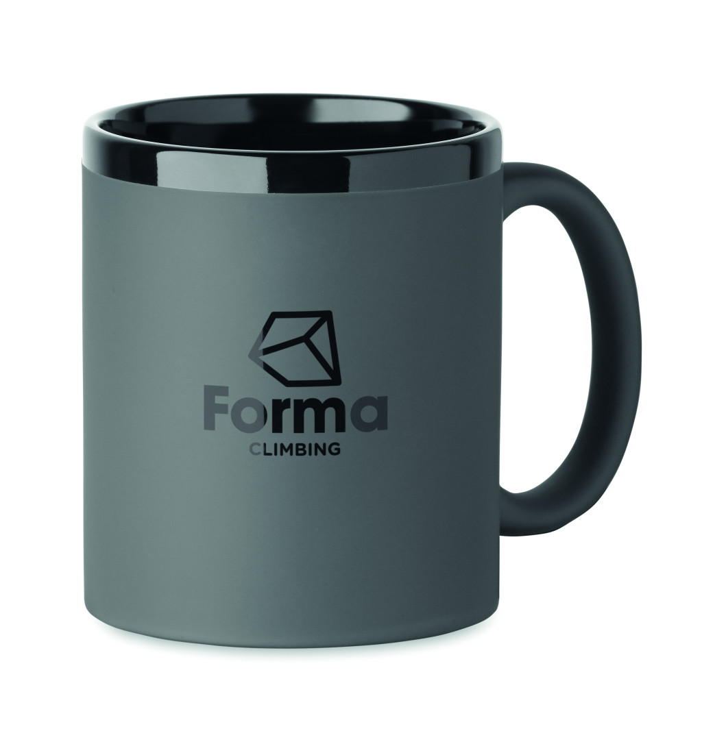 Kerámia bögre selymes tapintású külső bevonattal lézergravírozáshoz és fekete belső oldallal, illetve peremmel. Űrtartalom: 300 ml. Egyesével, fehér kartondobozba csomagolva.