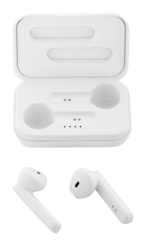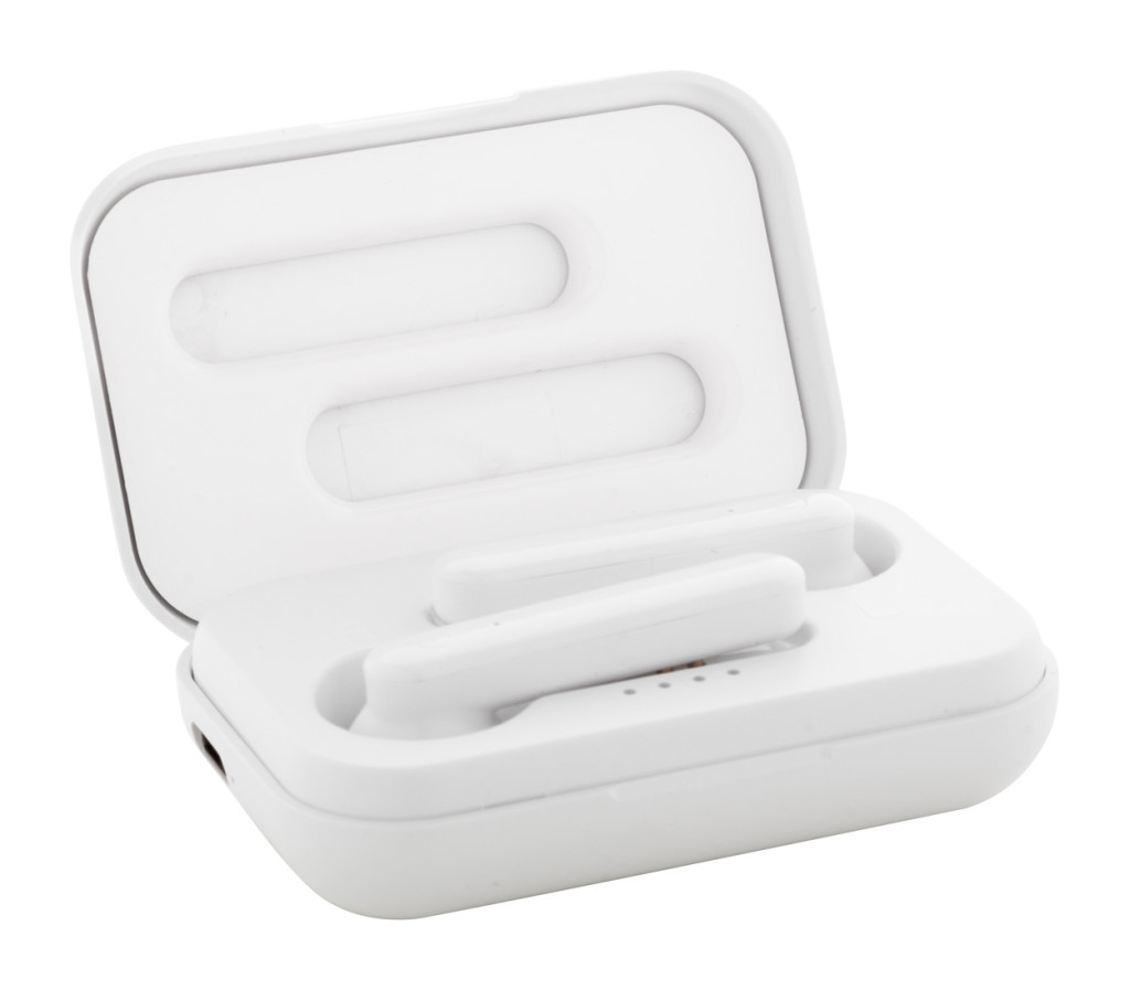 Újrahasznosított ABS műanyag bluetooth fülhallgató kihangosító funkcióval, műanyag töltő tokban, 400 mAh akkumulátorral. USB töltőkábellel szállítjuk.