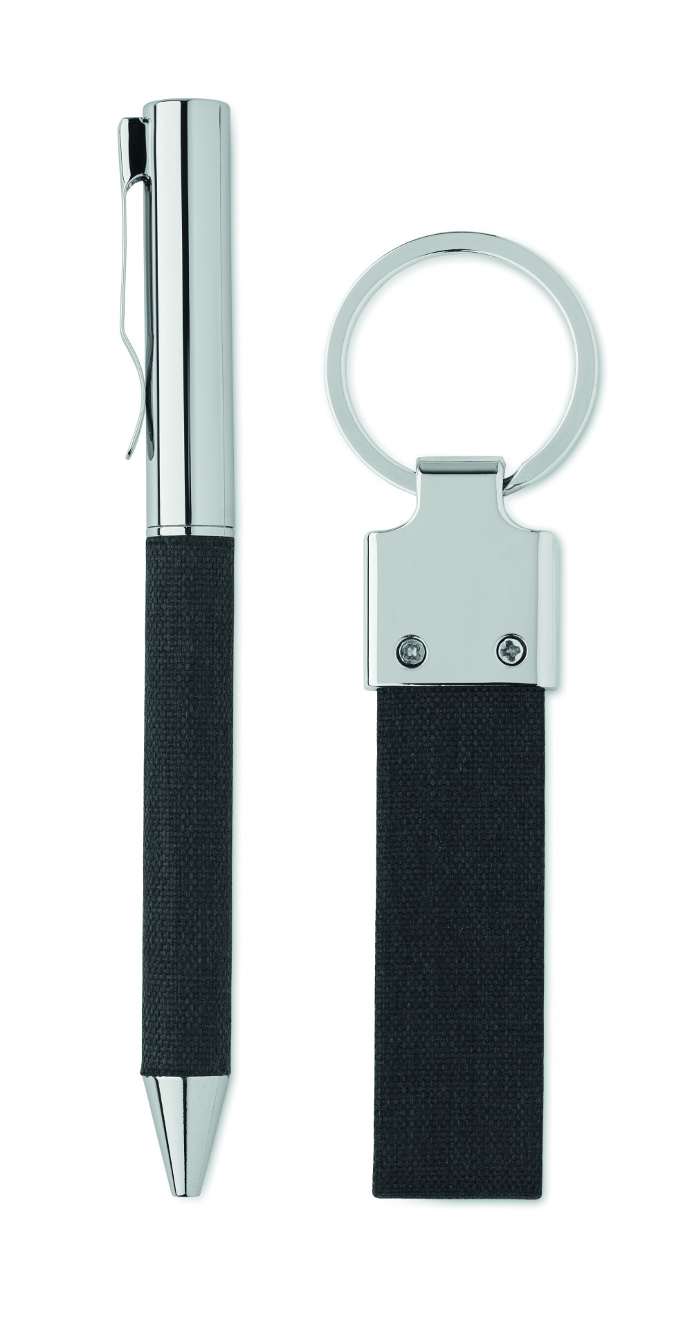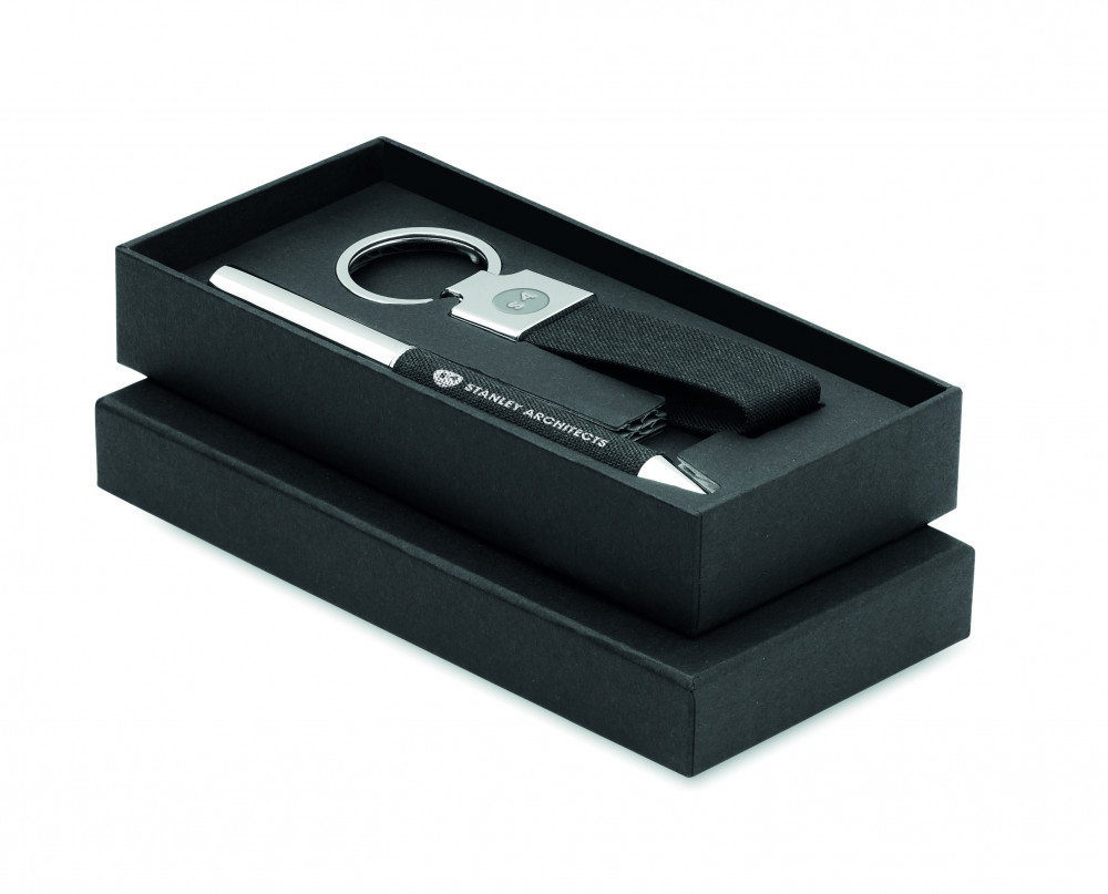 2 darabos ajándékkészlet díszdobozban. Tartalmaz egy csavarzáras fém golyóstollat RPET poliészter részletekkel és RPET poliészter kulcstartót. Kéken író betéttel.