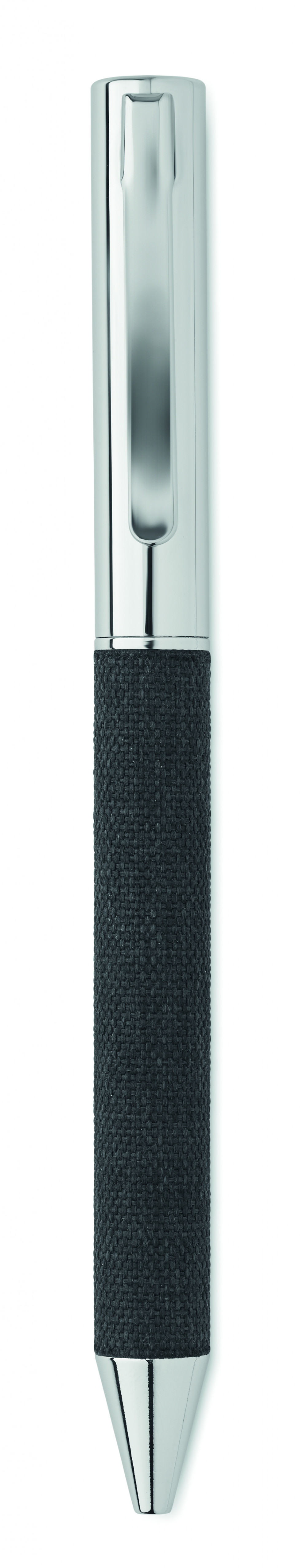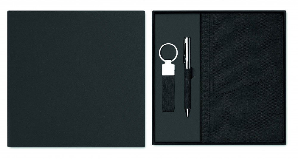 3 darabos ajándékkészlet díszdobozban. Tartalmaz egy csavarzáras fém golyóstollat RPET poliészter részletekkel, RPET keményfedeles jegyzetfüzetet okostelefon tartó zsebbel az elülső oldalán és RPET poliészter kulcstartót. Kéken író betéttel.