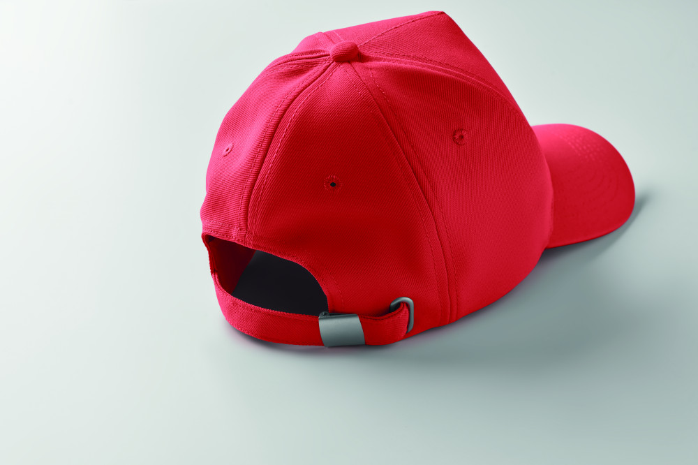 5 paneles baseball sapka 210 g vastag RPET poliészterből, ezüst színű acél csattal. 4 hímzett, színben illeszkedő szellőzőlyukkal. Méret 7 1/4.
