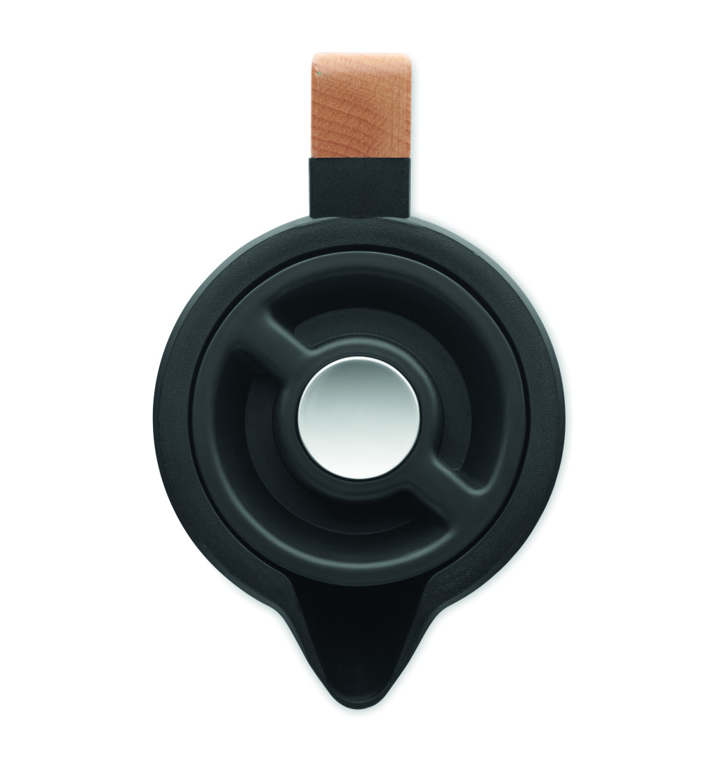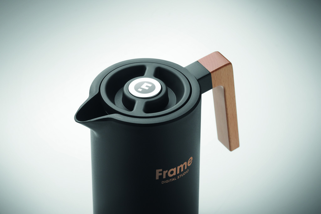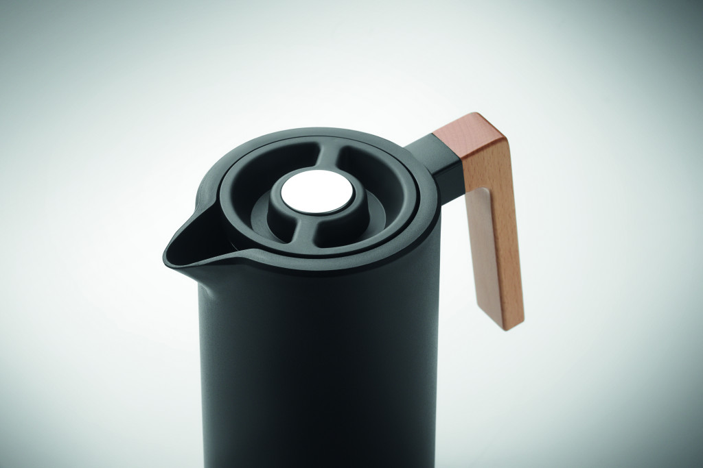 Duplafalú termoszkanna újrahasznosított rozsdamentes acél (90% újrahasznosított rozsdamentes acél és 10% rozsdamentes acél) belső és PP külső fallal, fa füllel. Űrtartalom: 1 liter.